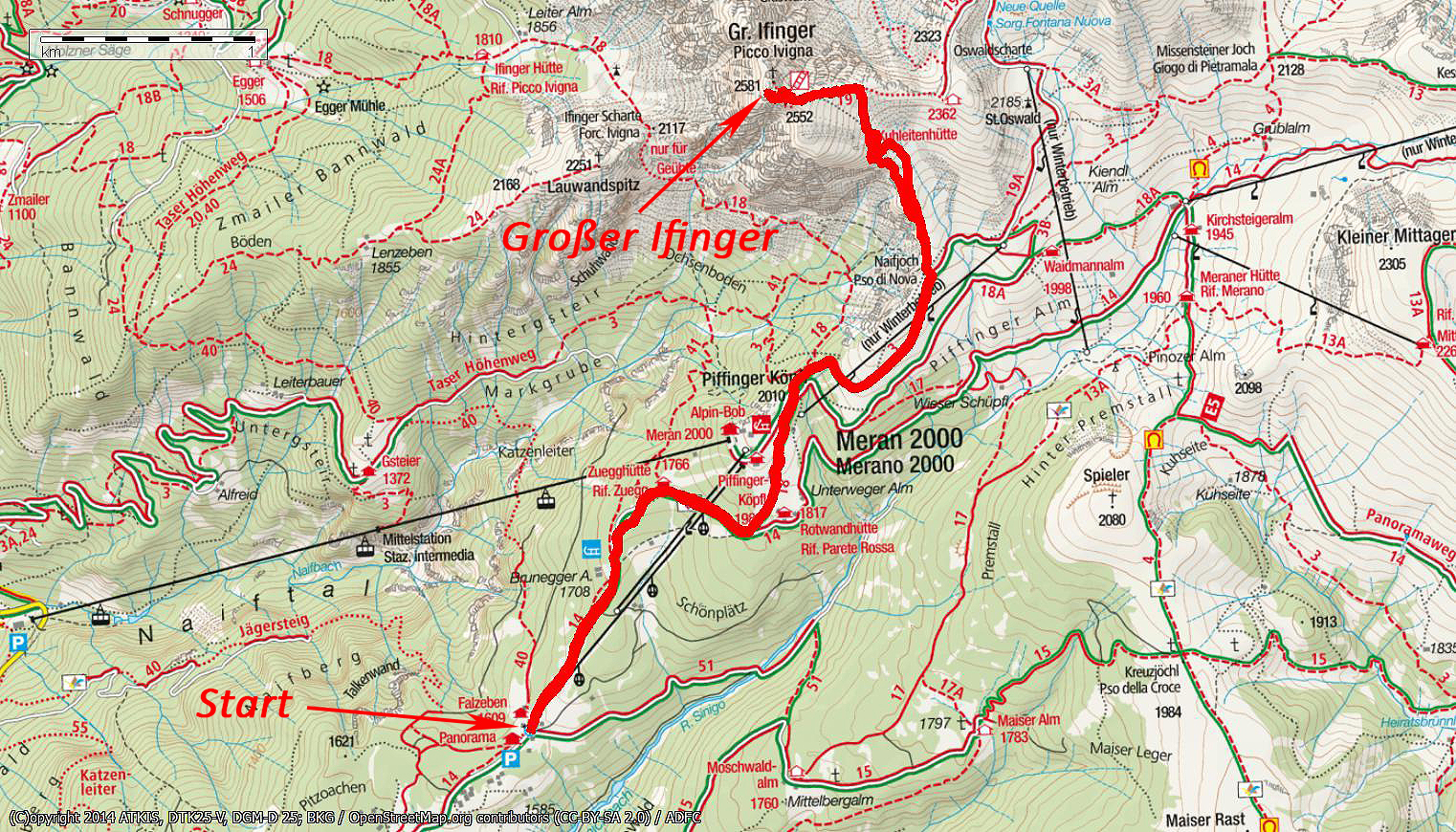 | Karten | Tabacco 011 "Meran und Umgebung" 1:25000 |