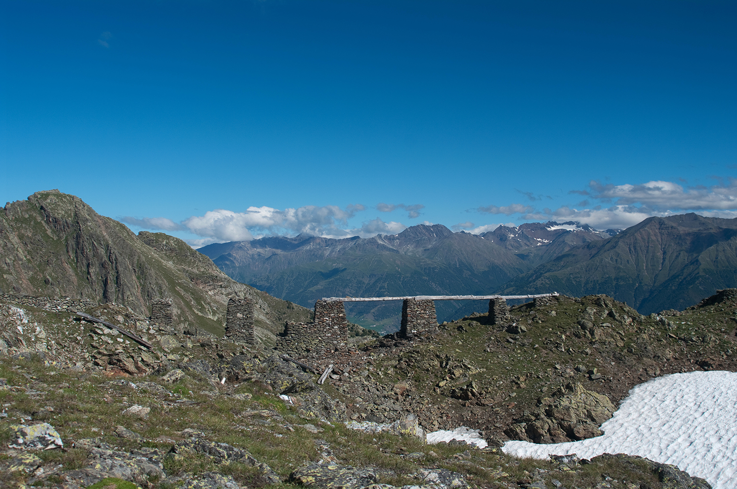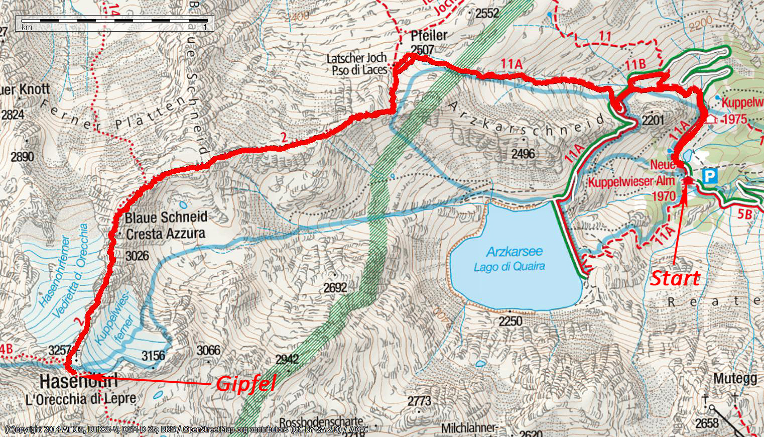 | Persönliche Bewertung | *** ca. 12,1 km; Viel begangen, trotzdem empfehlenswert. Die letzten 300 Hm über die Blaue Schneid zum Gipfel ziehen sich. Gletscher zieht sich immer mehr zurück. Auch super Schitourenziel für das Frühjahr, dann aber ca. 200 Hm mehr, da Straße nur bis zur Abzweigung zur Schaltstation ENEL geräumt. |