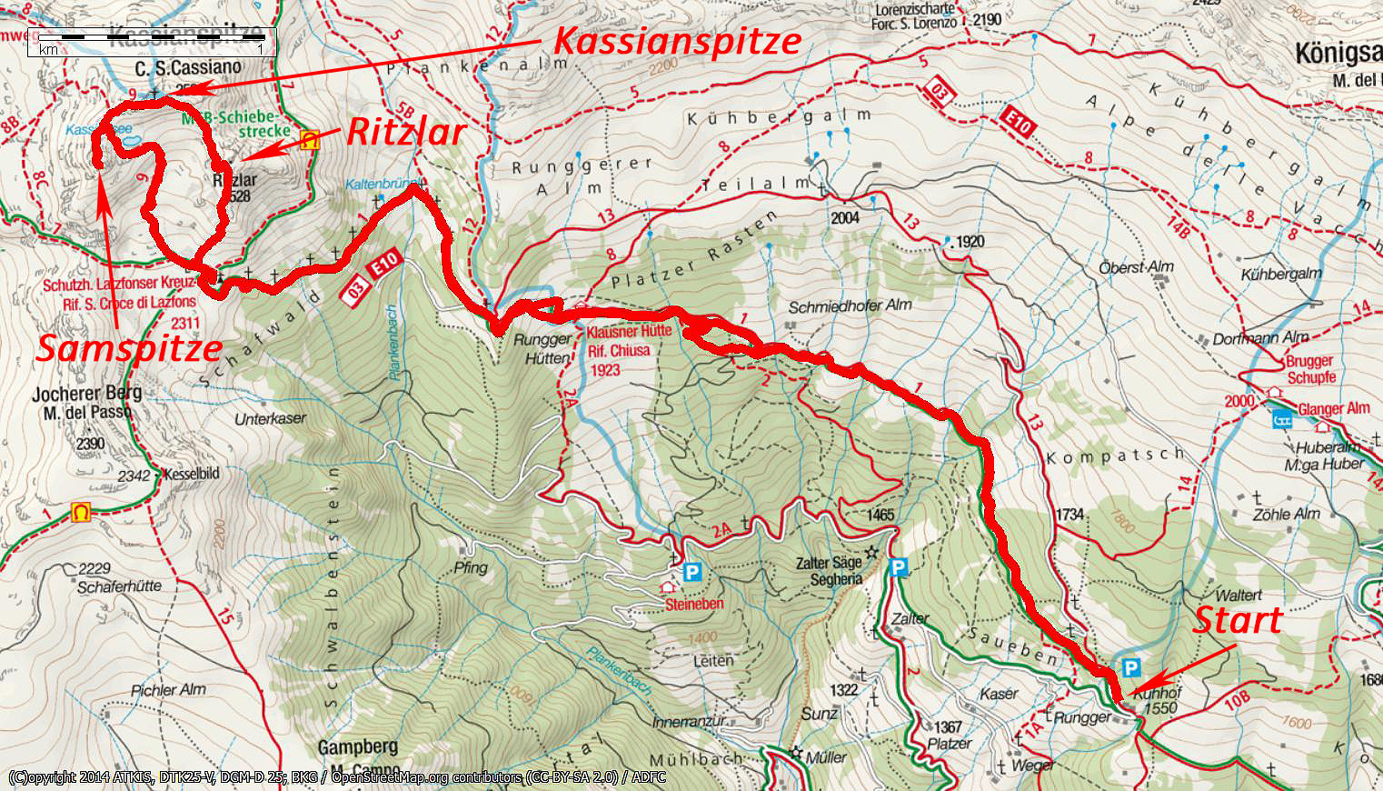 | Stützpunkt | Klausner Hütte (1923 m), Schutzhaus Latzfonser Kreuz (2311 m) |