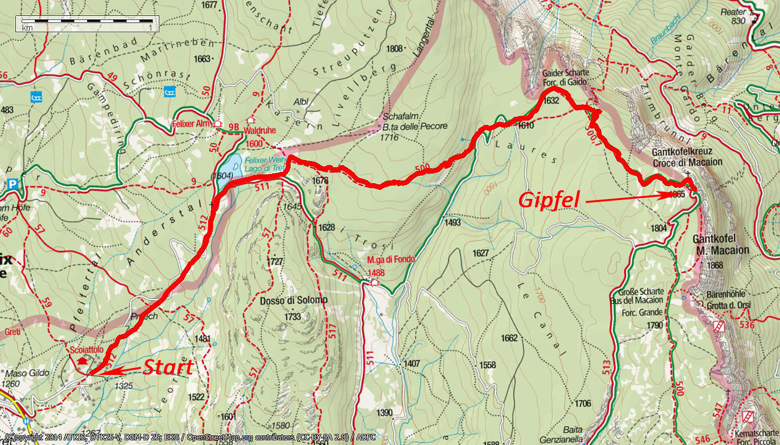 | Ausgangspunkt | Parkplatz beim Gasthof Scoiattoli (1332 m) |