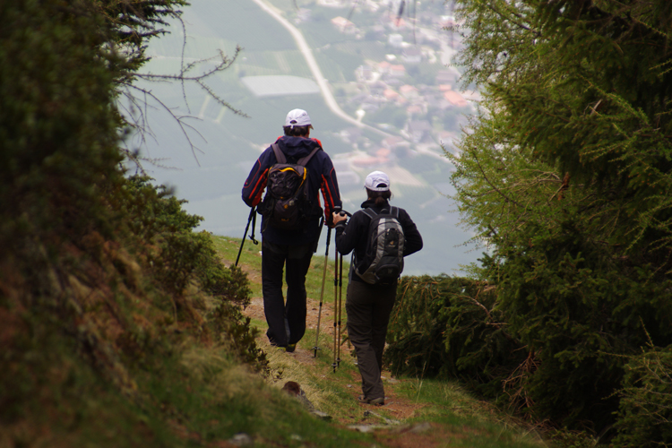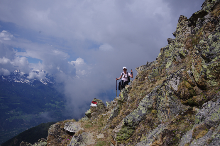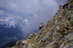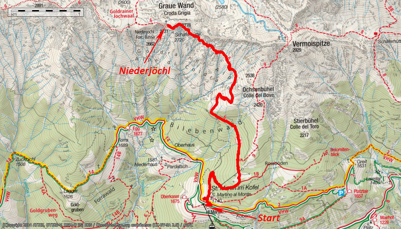 Da ab der Mittagszeit Gewitter und Regen vorhergesagt war, wurde relativ früh gestartet. Um knapp nach 8:00 h mit der Seilbahn nach St. Martin im Kofel. Anfangs auf Forstweg, dann auf Steig 6 durch den lichten Wald. Anfangs sonnig, aber einige Gipfel in der Umgebung bereits in Wolken gehüllt. Teilweise recht steil, nach der Waldgrenze weniger steil durch die steilen Südhänge (Goldrainer Alpe). Gipfel nun immer mehr in Wolken gehüllt, ebenso wie Sonne. Mit kleinen Zwischenabstiegen geht es stetig Richtung Kamm. Ein paar Meter unter der Scharte ist eine Nothütte, in der jemand übernachtet hat (T-Shirt,Schlafsack, Schuhe zum Trocknen ausgelegt bzw. gehängt). Am Kreuz, das den höchsten Punkt markiert, schnell ein paar Fotos gemacht, dann sofort wieder umgekehrt, da Norbert, der in Laufschuhen unterwegs ist, Sorge hat, dass der in Aussicht gestellte Regen, den Steig zur Rutschbahn machen würde. Eigentlich war geplant gewesen, die paar Meter weglos auf die Graue Wand aufzusteigen, um einen Gipfel abhaken zu können, aber die drohenden Wolken haben uns davon absehen lassen. Beim Abstieg graupelt es anfangs ein bißchen, hört aber bald auf. Bei einer Almhütte knapp oberhalb der Waldgrenze wird dann gerastet und das mitgebrachte Essen verzehrt, bevor das letzte Stück in Angriff genommen wird. Um 14:00 h wieder in St. Martin im Kofel. Wir nehmen nicht die nächste Bahn, sondern setzen uns noch ins Gasthaus und essen eine Kleinigkeit. Erst gegen 15:00 h geht's dann mit der Bahn nach Latsch. Dort genießen wir noch ein Eis. Das angesagte Gewitter hat es dann doch nicht gegeben.