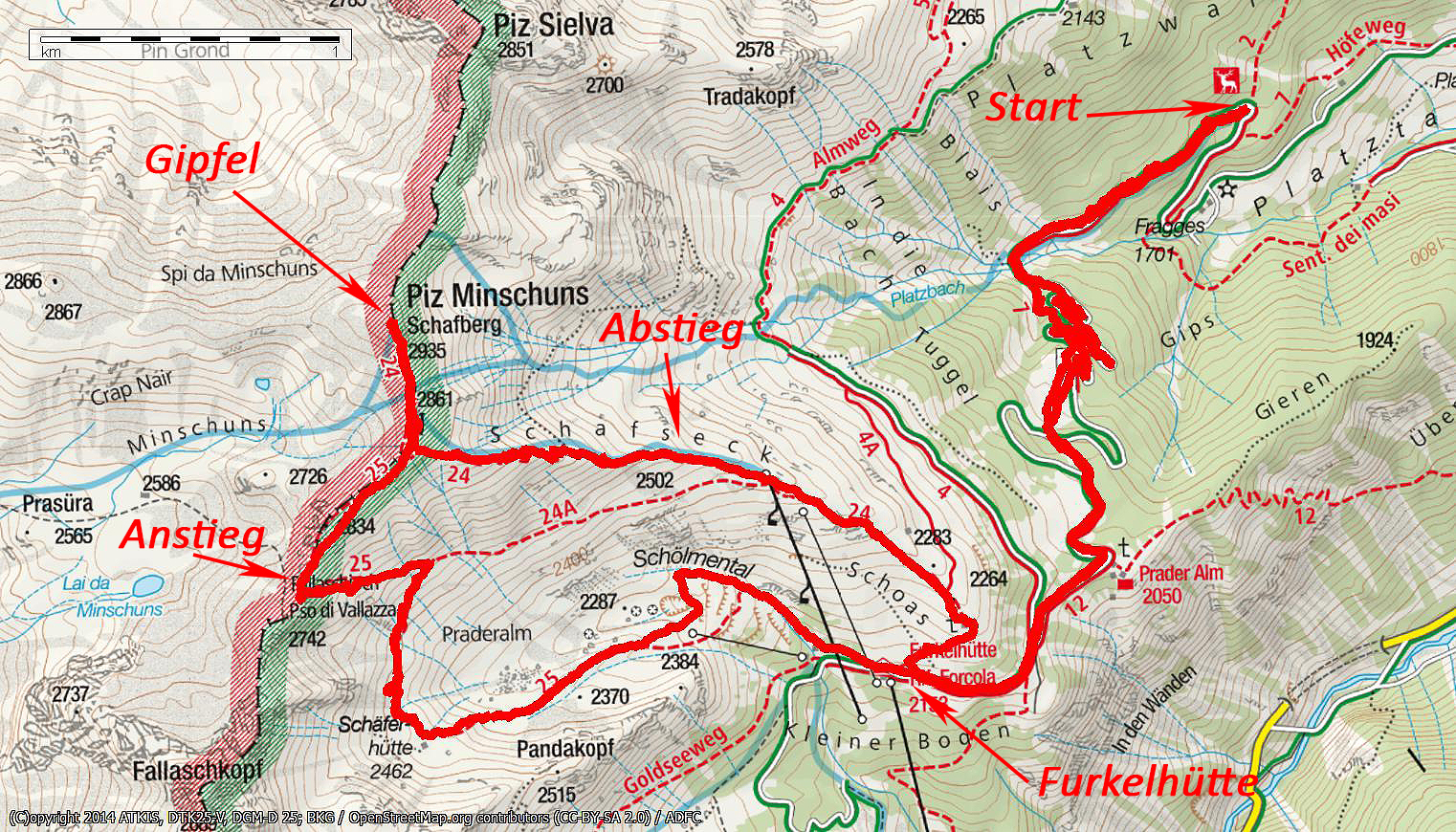 | Persönliche Bewertung | ** ca. 16 km; Anfangs auf Forstweg, dann durch das Stilfser Schigebiet, wenig begangen (die meisten gehen auf den Piz Chavalatsch), |