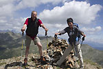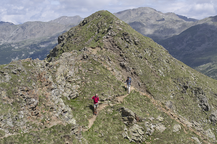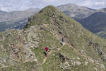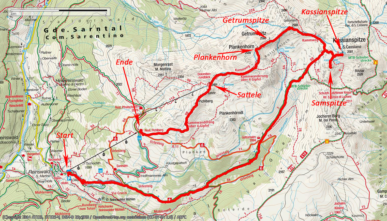 Bereits um 7 Uhr in Meran und um viertel nach acht beim Parkplatz der Kabinenbahn des Schigebietes von Reinswald los; Aufstieg über den Wirtschaftsweg zur Getrumalm; anfangs auf Teer, dann Schotter, nach der Getrumalm geht Weg in Steig über; ab Getrumalm mehr Wanderer, da viele mit der Kabinenbahn bis zur Pichlberghütte auffahren und dann leicht abfallend zur Getrumalm herüberkommen; der Steig führt unter das Gipfelduo Kassianspitze-Samspitze (Gipfelkreuz der letzteren schon lange sichtbar) und dann steiler ins Joch zwischen die beiden Gipfel; dort mündet auch der Steig von Latzfonser Kreuz ein; zuerst auf die Samspitze; spitzen Rundsicht, kein Vergleich mit vergangenem Herbst, bei dem wir knapp unter der Nebelobergrenze geblieben sind und kaum etwas sahen; einen Riegel vertilgt, Fotos gemacht und weiter zur Kassianspitze; dort wiederholt sich das Ganze; da wir noch 3 Gipfel vor uns haben, trödeln wir nicht und starten bald wieder; Abstieg auf 2440 m und Wiederaufstieg auf die Getrumspitze; von dort geht es immer am Kamm und in nur geringem Auf und Ab Richtung Plankenhorn (ziemlich genau westlich gibt es noch ein Plankenhorn, zwischen Lorenzispitze und Schrotthorn); in der Mitte des Kamms eine kurze versicherte Stelle (Plattenaufstieg) und dann zum Schluss ein paar Meter mehr Abstieg und Wiederaufstieg zum Gipfel mit Kreuz des Plankenhorns; laut digitaler Karte auf www.suedtirol-trekking.info befindet sich der Gipfel der Getrumspitze nicht am Nordende des Kammes, sondern bei der höchsten Erhebung in der Mitte des Kammes und ist 2590 m hoch, also höher als das Plankenhorn; in dieser Hinsicht traue ich mehr dem AVS, der die digitale Karte vor Ort aufgenommen hat und nicht der Tabacco-Karte (obwohl ich oben Höhe und Position der Getrumspitze entsprechend Tabacco angebe), es wäre nicht das erste Mal, dass eine Tabacco-Karte daneben liegt (markierte Wege in der Karte angegeben, die es in Wirklichkeit nicht gibt usw.); da es am Gipfel des Plankenhorns scheußlich windet, steigen wir sofort weiter ab und rasten in einer windgeschützten Mulde unterhalb des Gipfels; unsere erste längere Rast; tut gut; danach bummeln wir am Kamm entlang, wiederum mit einigem Auf und Ab, zum Sattele, dem 5. und letzten Gipfel des Tages (hat sogar ein Gipfelkreuz, wenn auch nur ein paar Meter oberhalb der Bergstation eines jetzt im Sommer stillstehenden Liftes); von hier aus sehen wir das Ziel des Tages ein paar Hundert Höhenmeter tiefer - die Pichlberghütte und die Bergstation der Kabinenbahn; die letzten paar Höhenmeter Abstieg bringen uns auch nicht mehr um und nach insgesamt über 8 Stunden findet ein wundervoller Bergtag sein Ende.