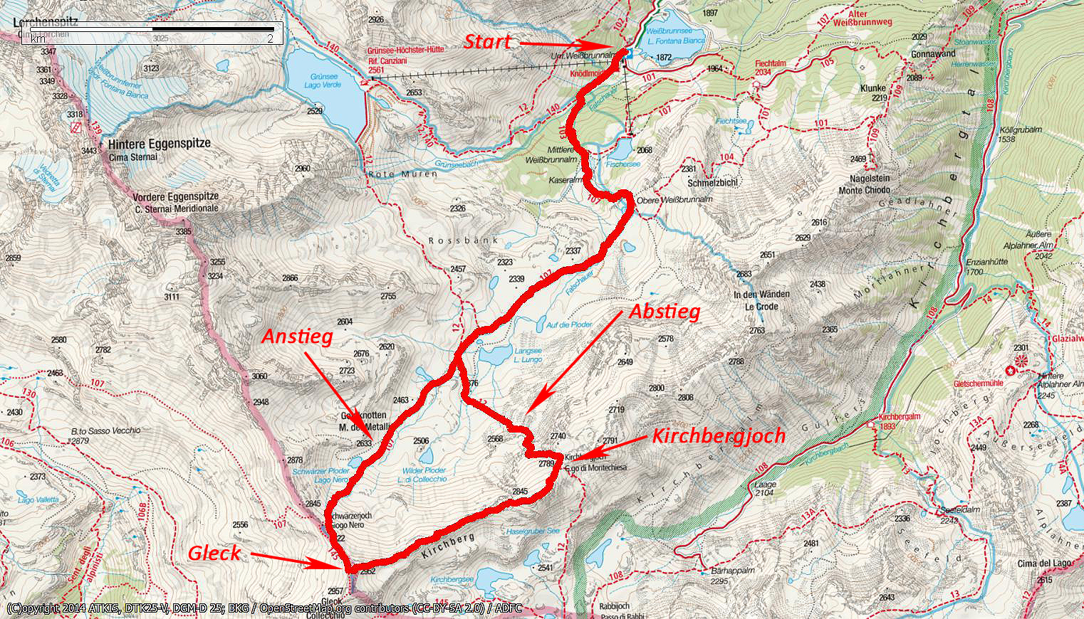 | Persönliche Bewertung | ** Zieht sich, immer wieder Aufschwünge mit nachfolgenden Flachstücken, viel begangen, Ausblick etwas eingeschränkt, da die Berge rundum fast alle höher sind, insgesamt um die 16 km (7 km bis Gipfel, 9 km Rückweg über Kirchbergjoch. |