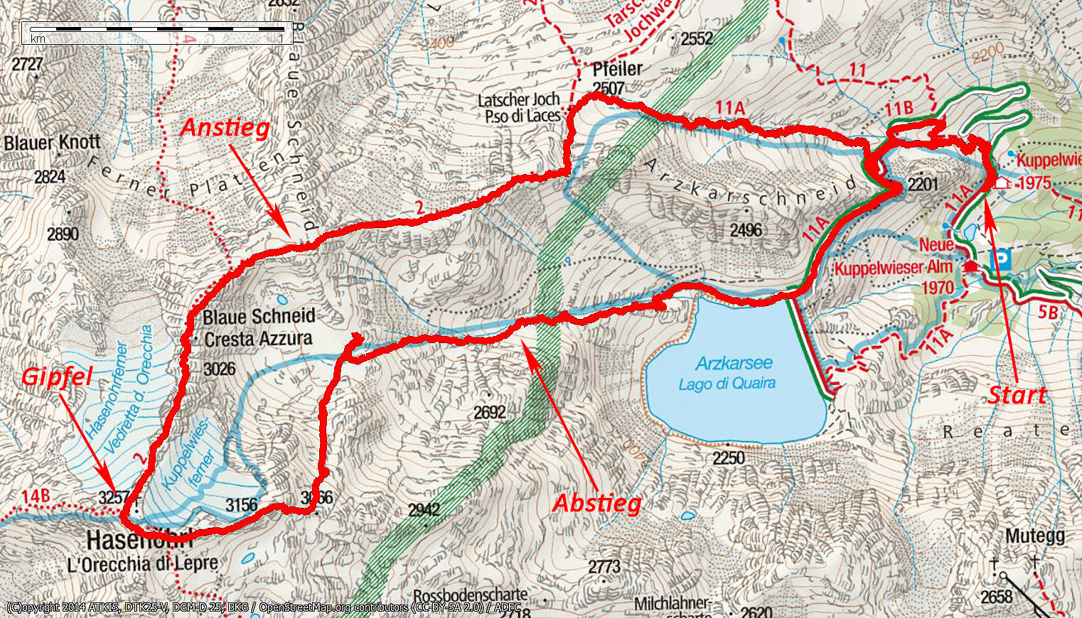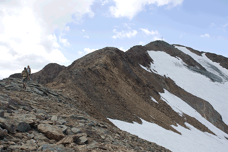 | Persönliche Bewertung | *** ca. 13,1 km; Viel begangen, trotzdem empfehlenswert. Die letzten 300 Hm über die Blaue Schneid zum Gipfel ziehen sich. Gletscher zieht sich immer mehr zurück. Auch super Schitourenziel für das Frühjahr, dann aber ca. 200 Hm mehr, da Straße nur bis zur Abzweigung zur Schaltstation ENEL geräumt. |