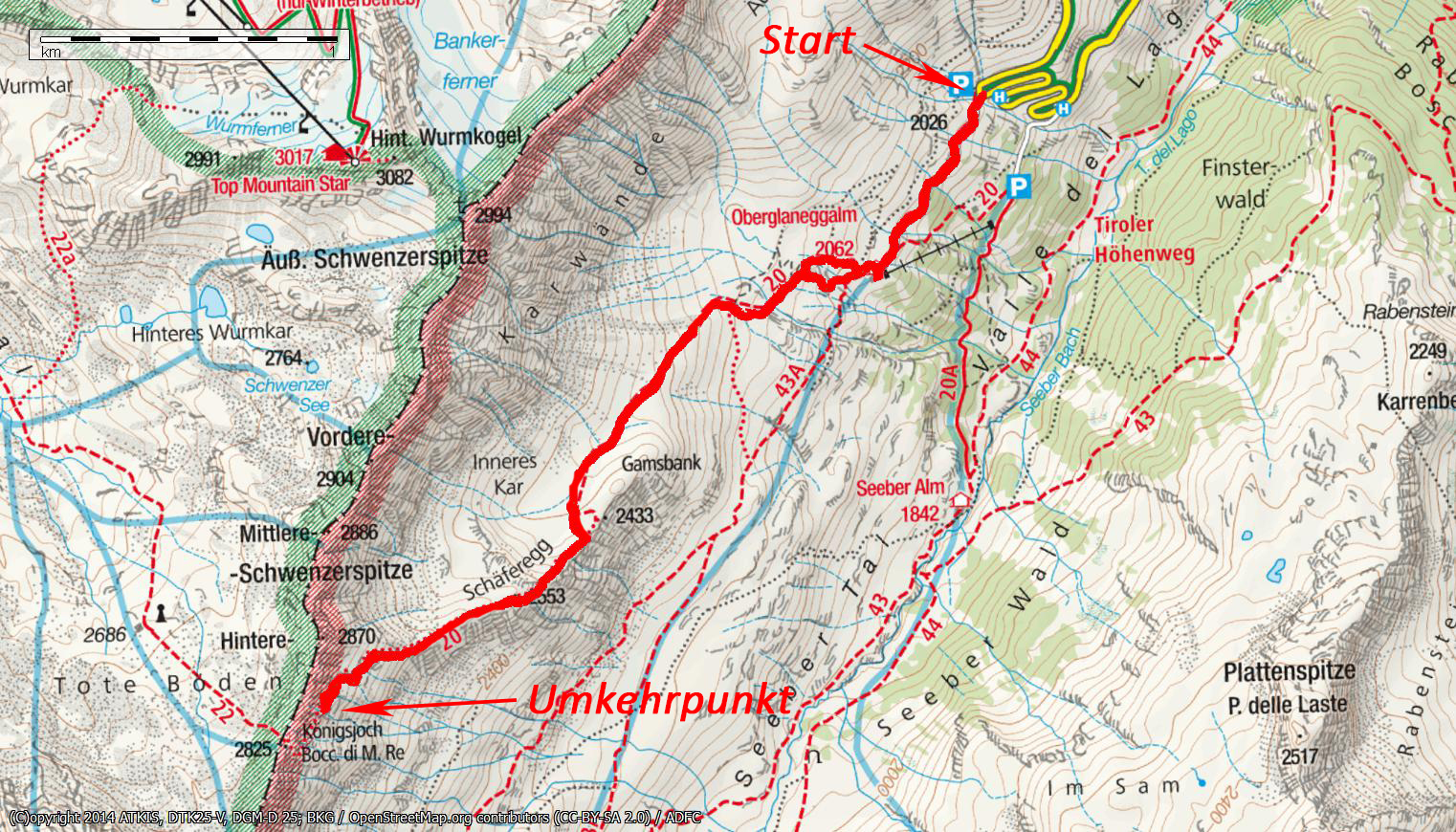 | Ausgangspunkt | Timmelsjoch-Hochalpenstrasse, Kurve mit Abzweigung zu Oberglaneggalm (2020 m) |