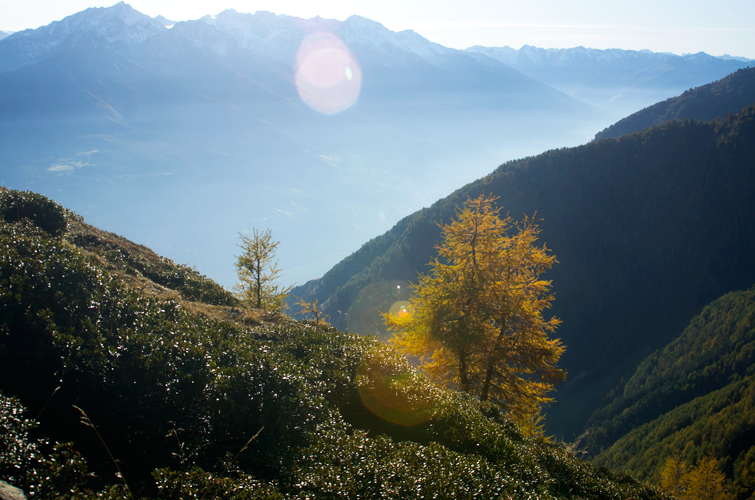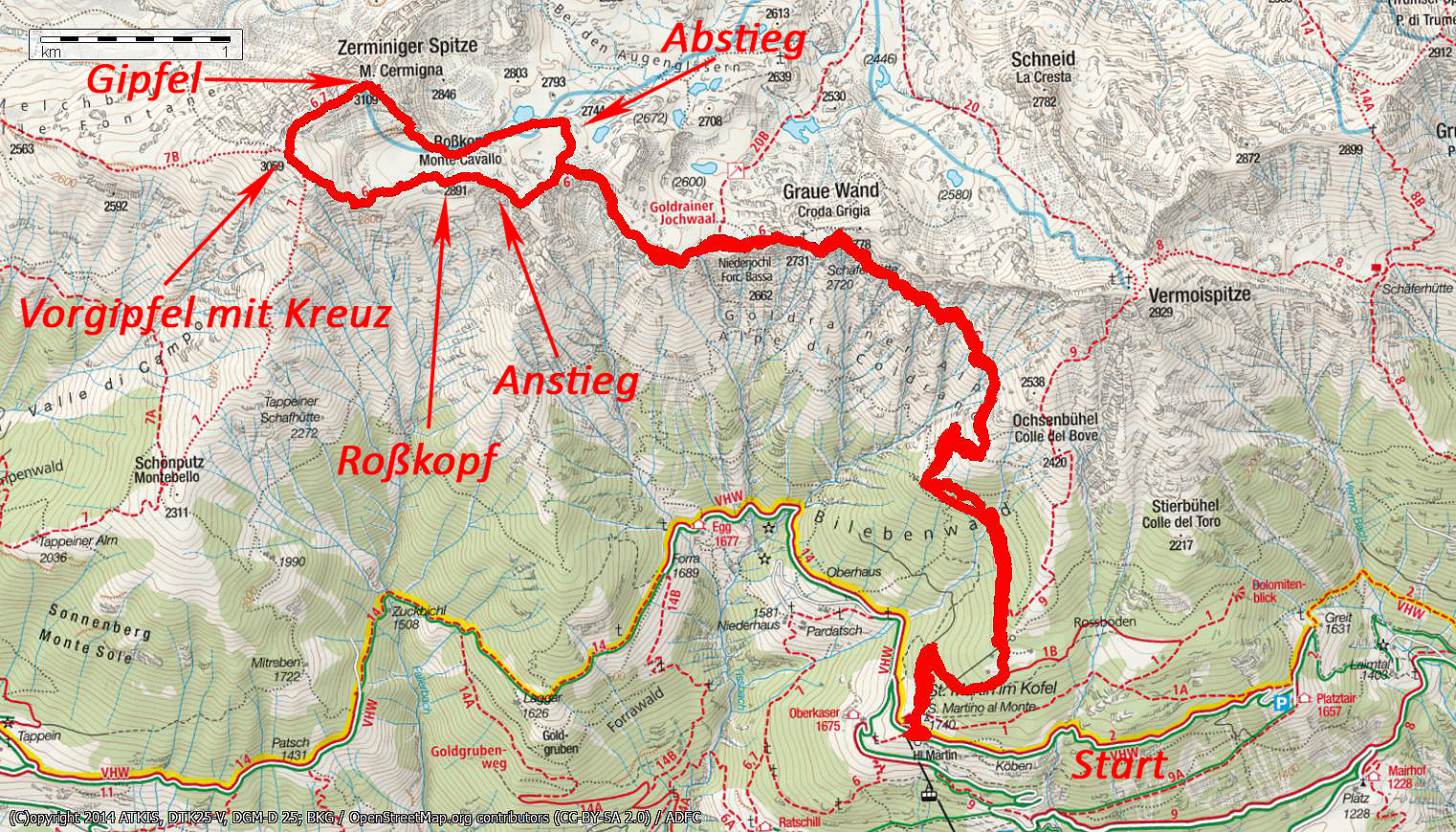 Um 06:45 h in Meran gestartet, um Bahn um halb acht nach St. Martin im Kofel zu erwischen, was gelingt. Anfangs auf Forstweg, dann auf Steig 6 durch den lichten Wald. Teilweise recht steil, nach der Waldgrenze weniger steil durch die steilen Südhänge (Goldrainer Alpe). Mit kleinen Zwischenabstiegen geht es stetig Richtung Kamm. Ein paar Meter unter der Scharte ist eine Nothütte, gleich danach ist man am Kreuz, das die Scharte (?) markiert (stimmt nicht, da das Niederjöchl ca. 100 Hm tiefer liegt. Wir waren eigentlich recht schnell beim Kreuz und daher hatte ich die Illusion, dass wir in höchstens einer weiteren Stunde am Gipfel wären. Pustekuchen. Es geht, wie gesagt, erst Mal 100 Hm abwärts in das eigentliche Niederjöchl. Von dort zuerst aufwärts, dann wieder einige Höhenmeter absteigen, dann überschreitet man den Roßkopf mit anschließendem Abstieg, bevor es endgültig zum Zerminger geht. Am Kreuz angelangt, ist man jedoch nicht am Gipfel, sondern es geht weiter über den Kamm (mit einem bißchen Auf und Ab) nach Norden zum eigentlichen Gipfel ,der nur mit einer Stange und einem Holzschild (Inschrift "Zerminiger 3109 m") gekennzeichnet ist. Ein Gipfelbuch ist auch da. Die Unsitte, das Kreuz nicht am höchsten Punkt aufzustellen, sondern dort, wo es vom Tal aus sichtbar ist, greift um sich. Als ich das erste Mal am 04.08.1991 aus dem Penaudertal auf den Gipfel gestiegen bin, gab es zwar bereits das Kreuz am Vorgipfel, am eigentlichen Gipfel war noch nichts vorhanden. So viele Leute wie dieses Mal waren damals auch nicht da. Da aber so spät im Jahr der Zerminiger aufgrund seiner Lage einer der wenigen 3000er ist, den man noch ohne große Schneeberührung besteigen kann, lockt dies wahrscheinlich einige einheimische Wanderer an. Wir sind nach ca. 4,5 Stunden am Gipfel. Karin flucht wie ein Rohrspatz, da sie das ganz Auf- und Ab sowie die Tatsache, dass nach dem Kreuz noch ein Stück zum Hauptgipfel zu steigen ist, nicht erwartet hat. Nach einer angemessenen, längeren Rast beschließen wir direkt und weglos über den Südostrücken zu den Augengläsern abzusteigen und entlang eines alten zugeschüttenen Waales (Goldrainer Jochwaal) fast eben den Roßkopf zu umrunden und so einige Wegstrecke und einen Gegenanstieg zu vermeiden. Nachdem der ärgste Knieschinder hinter uns liegt, wird bei der kleinen Almhütte knapp ober der Waldgrenze kurz gerastet. Um knapp nach halb sechs erreichen wir St. Martin und nützen die Gelegenheit, sofort mit der Bahn abzufahren.