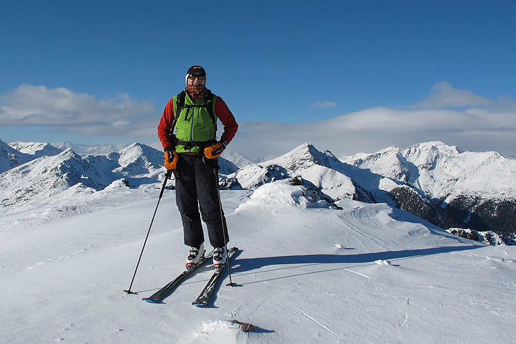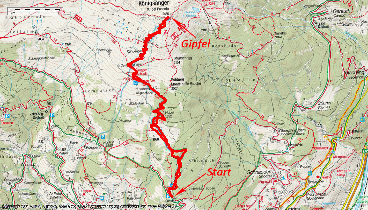 Nachdem ich den Königanger letzte Woche zu Fuß bestiegen hatte, wollte ich diesen Sonntag (Christtag) das erste Mal die Schi verwenden. Ich war alleine und das Wetter Richtung Norden nicht so gut, also kam nur eine Tour in Frage, die ich kenne. Letzte Woche war eine ganze Menge Schitourengeher auf den Königanger unterwegs, die Schneedecke bekannt bescheiden (wie derzeit fast überall in Südtirol), aber immerhin vorhanden. Ich wählte also den Königanger; den gleichen Berg inner3halb einer Woche zweimal zu machen, war eher ein Novum für mich. Mein bisheriger diesbezüglicher "Rekord" war zweimal den gleichen Berg innerhalb von 14 Tagen. Ich habe zuhause beim Frühstücken und Zusammenpacken etwas getrödelt (entschuldigt, da alle Sachen für die erste Schitour zusammensuchen erfordert etwas mehr Zeit :-)) und bin daher erst um 10 nach 10 wieder vom Garner Kreuz aus gestartet. Zeitgleich mit mir startet ein Bergläufer, der bis zur Brugger Schupfe wollte und mir bereits wieder im Abstieg entgegen kam, bevor ich den Weg zur Brugger Schupfe halbwegs zurück gelegt habe. Bis zur Schupfe war es ziemlich warm und windstill; ab da wurde es dann windig und kälter. Die Schispuren von letztem Sonntag waren größtenteils windverweht; die paar, die sichtbar waren, standen eher hervor, da der Wind den Schnee rundum verblasen hatte, während der unter den Schiern zusammengedrückte Schnee etwas Widerstand geleistet hat. Der Anstieg mit Schi war jedenfalls etwas weniger angstrengend, als letzte Woche zu Fuß, was sich auch in einer etwas kürzeren Aufstiegszeit ausgedrückt hat (20 min schneller). Am Gipfel treffe ich einen Österreicher; wir machen gegenseitig Fotos und ich wechsle schnell in den Abfahrtsmodus, so dass ich mit ihm abfahren kann. Kleine Sicherheitsmaßnahme. Wie bereits im Anstieg erwartet, war die Abfahrt der schlechteste Teil der Tour. Bruchharsch, abwechselnd mit windgepreßtem Schnee. Mein linkes Knie verflucht mich, da mit Kraft und weniger Technik zu fahren ist. Die Oberschenkel brennen und alle paar Kurven raste ich und schnappe nach Luft. Bald sind wir an der Meraner Hütte; ich raste jetzt und der Österreicher fährt weiter. An der windgeschützten Ostseite treffe ich ein italienisches Paar, das mit Schneeschuhen aufgestiegen ist. Wir ratschen ein bißchen und wünschen uns gegenseitig frohe Weihnachten. Nach ausgiebiger Rast fahre ich die letzten Meter bis zum Wirtschaftsweg bei der Brugger Schupfe ab und diesem weiter. Zwischendurch nutze ich offene Lichtungen, in der Hoffnung dort besseren Schnee zu finden. Pustekuchen. Erst kurz vor dem Auto finde ich auf einer Lichtung an der Schattenseite Pulver. Unglaublich, ich kann noch Schifahren, zumindest für diese 10 Meter. Nach 50 min Abfahrt (gerechnet ohne Rast bei Meraner Hütte) bin ich wieder beim Auto und froh, dass diese Tortur vorbei ist.