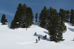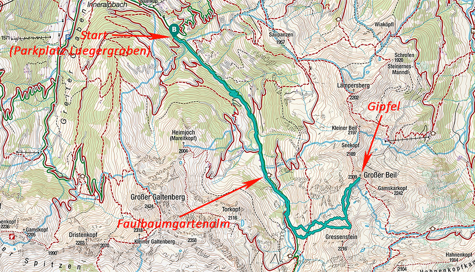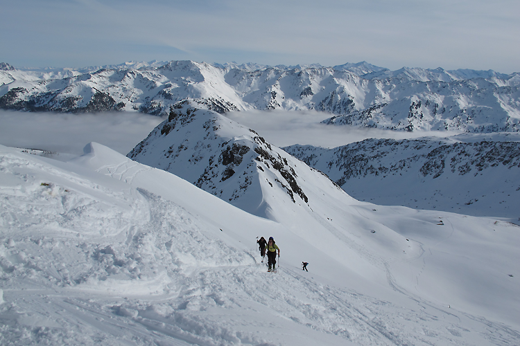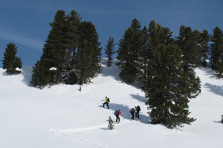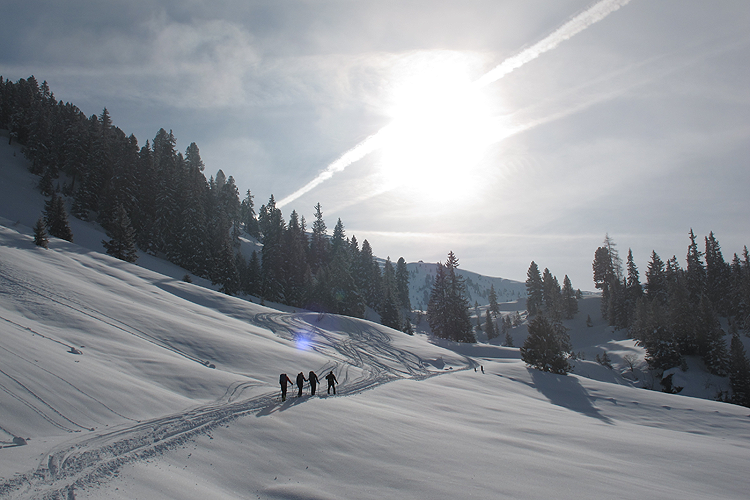 Am Sonntag, den 29.01.2012 war es dann soweit. Ich bin bereits am Samstag angereist und habe im Hotel Sonnhof (empfehlenswert; preiswert, gut und freundlich) in Radfeld übernachtet, um jeden morgendlichen Stress am Sonntag zu vermeiden. Um dreiviertel neun treffen bei Ausfahrt Kramsach, dann geht's weiter nach Inneralpbach bis zum Parkplatz Luegergraben (gebührenpflichtig, € 2,00, wird von Vroni übernommen). Um 09:40 h beim Parkplatz los; anfangs ein paar Probleme mit einer Bindung einer Teilnehmerin; werden aber mit Hilfe eines Kreuzschraubenziehers eines weiteren Teilnehmers gelöst. Auf dem Rodelweg in sanfter Steigung zur Faulbaumgartenalm (bis hierher 1 Stunde 15 Minuten). Nachdem ich letzte Woche noch mit Grippe im Bett lag, gehe ich es noch langsamer an als üblich. Bald nach der Alm löst sich der Hochnebel auf und wir kommen in die Sonne. Bei der Alm teilt sich unsere Gruppe; zwei gehen mit Vroni bis zur nächsten Alm, während die restlichen vier mit Fred vorausgehen. Vroni als Rennläuferin holt uns noch problemlos vor dem Gipfel ein. Ein erster Hang wird in einigen Spitzkehren überwunden. Kurze Rast, dann geht es weiter zum Kamm. Ich immer hinterher, der Abstand wächst zwar, aber so langsam komme ich mit (versuche den Puls nicht über 145 steigen zu lassen). Ab dem Kamm geht es dann im Auf- und Ab bis zum Gipfel. Aus der Wildschönau steigen verschiedene Gruppen auf. Auf dem Gipfel gibt es die obligaten Gipfelbussi, ein paar Fotos und Zeit die mitgebrachten Brote zu vertilgen. Schi werden auf Abfahrt gestellt und die Schuhe geschlossen. Nach ein paar Meter Abfahrt steigt Fred mit den Anderen ein paar Meter auf, um einen schönen unverspurten Hang abfahren zu können. Verzichte auf den Aufstieg und habe dadurch ein paar Meter weniger Abfahrt. Am Ende des Kammes queren wir ohne viel Höhenverlust nach Süden, bevor es dann in unverspurtem Pulver den ersten Hang hinunter geht. In dieser Art folgen noch ein paar weitere Hänge. Super Pulver, praktisch unverspurt. Ein Wunder. Bei uns wären solche Hänge einen Tag nach dem Schneefall komplett zerfahren. Bald sind wir wieder bei der Faulbaumgartenalm, wo die beiden anderen Teilnehmerinnen bereits auf uns warten. Es gibt eine gute Marende mit viel Erdinger Alkoholfrei (dem Sponsor, was des Sponsors ist, in Abwandlung eines lateinischen Sprichwortes). Eine Abfahrt über die Rodelbahn bringt uns dann wieder zurück zum Parkplatz. Einige Rodler und mehrere Schneeschuhgeher müssen dabei umkurvt werden.