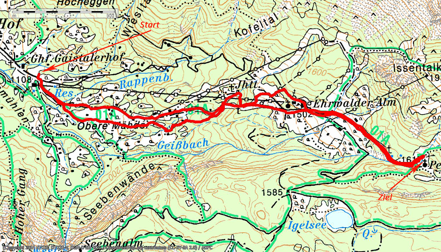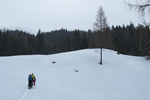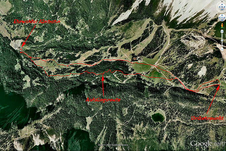 Am Sonntag bin ich dann etwas früher gestartet (09:27 h), da ich dann gemütlich nach Hause fahren wollte. Wie am Vortag anfangs auf der Piste und dann rechts ab, aber diesmal der anderen Spur folgend. Diese führte weiter von der Piste weg und diese blieb praktisch bis zur Ehrwalder Alm außer Sicht. Hatte echtes Schitourenfeeling. Steilstück durch den Wald. Auch zwei andere Gruppen nutzten diese Spur. Ich war knapp schneller als am Tag zuvor und daher bin ich vom gestrigen Endpunkt auch noch einen Steilhang aufgestiegen, bevor ich nach knapp über 2 Stunden entschieden habe, dass es für heute genug sei. Rast mit Tee und Müesliriegel. Abfahrt ebenso wie Aufstieg besser als am Tag zuvor. Aufstieg fast schmerzfrei und Abfahrt etwas weniger Schmerz und sicherer auf den Schi. Positiv.