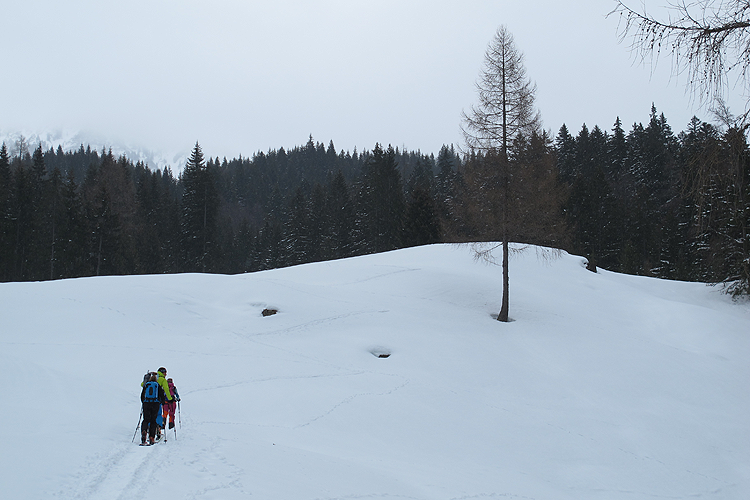 Ich hatte seit Ende Januar keine Schitour mehr gemacht und vor 10 Tagen im linken Knie eine Arthroskopie gehabt, um die Narbenbildung einer eingerissenen Quadrizepssehne entfernen zu lassen. Wollte aber trotzdem nicht das Zimmer absagen und alles sausen lassen, da ich das gleiche Hotel bereits letztes Jahr absagen musste (Achillessehnenriss) und die Tiefschneetage auch schon zweimal abgesagt hatte (Kletterunfall und Achillessehnenriss). So habe ich beschlossen, doch hinzufahren und eben versuchen ein bisschen die Pisten hinaufzugehen, soweit es eben ginge.