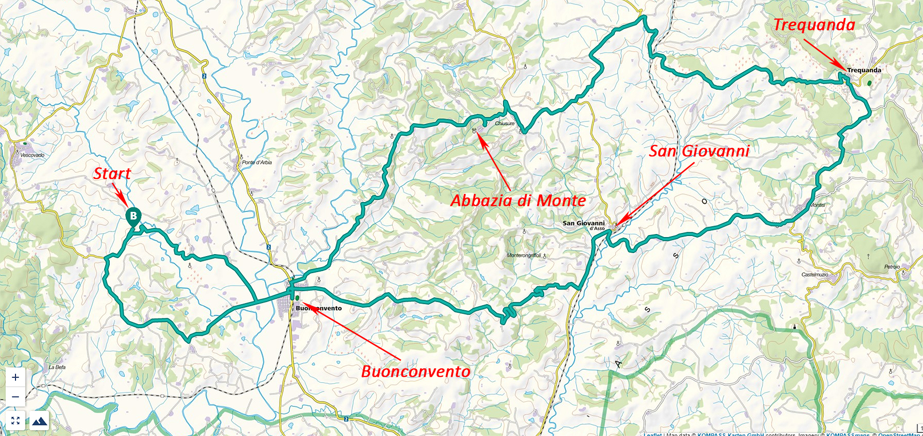 | Karten | Kompass Nr. WK 2463 "Lago Trasimeno - Area Protetta Val d'Orcia", 1:50000, ISBN 978-3-85026-606-2 sowie gegebenenfalls Kompass Nr. WK 662 "Lago Trasimeno-Val di Chiana-Chianciano Terme", 1:50000, ISBN 978-3-85491-565-2 und Kompass Nr. WK 661 "Siena-Chianti-Colline Senesi", 1:50000, ISBN 978-3-85491-420-4 |