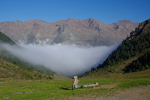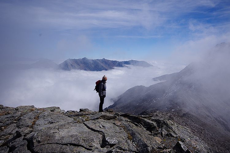 Start in Meran gegen halb acht, bei den Glieshöfen um knapp vor neun. Bewölkt bzw. Hochnebel. Auf dem üblichen Wirtschaftsweg bis zur Upialm; kurz vor Upialm beginnt sich der Nebel aufzulösen und die Sonne kommt durch; Im Kar südwestlich der Alm sehen wir zwei Wanderer im Aufstieg zur Remsspitze;über die nächsten zwei Aufschwünge geht es zum Upisee; das Kreuz vom Litzner glänzt in der Sonne zu uns herab und erinnert mich an meinen damaligen Aufstieg durch ein Schotterkar weglos zum Gipfel und den weglosen Abstieg nach Westen über steile Hänge und dichten Wald mit hohen Farnen bis zur Strasse zu den Glieshöfen; war damals nicht so geplant, Inukshukaber alles gut gegangen. Heute wollen wir aber zum Upikopf. Aus unseren/meinen frühreren Besteigungen sind wir davon ausgegangen, weglos zum Pleisenjöchl aufzusteigen und über den Kamm nordwärts zum Gipfel. Wir erwarten daher, dass die Markierungen, bald verschwinden würden, aber zu unserer Überraschung gibt es nunreichlich Markierungen und einen Steig, der bald nach dem Upisee nach Norden abbiegt und steil in vielen kurzen Kehren zum Vorgipfel und weiter am Kamm NNO zum Gipfel, der seit Herbst 2011 auch ein Kreuz aufweist, das dem verunglückten früheren Hüttenwirt der Oberetteshütte, Roman Burgo, gewidmet ist. Der Weg über den Vorgipfel scheint schon länger zu bestehen, da er im Führer von Menara von 2007 bereits angeführt ist. AmGipfel stehen wir über einem Wolkenmeer, aus dem nur die höheren Gipfel herausragen; nach Norden sind die meisten Gipfel in Wolken gehüllt. Unsere Spitze ist eine der wenigen, die frei von Wolken ist, obwohl zwischendurch einige Nebelfetzen aufsteigen und den Gipfel ganz kurz einhüllen. Ein Windchen weht und es ist trotz Sonnenschein eher frisch. Nach der üblichen Pause mit Fotos und Marende beschließen wir über das Pleisenjöchl abzusteigen. Obwohl es für Elisabeth das erste Mal ist, dass sie weglos absteigen muss, meistert sie die Aufgabe problemlos (und das trotz Blasen von den fast neuen Schuhen). Es gibt zwar zwischendurch einige Trittspuren, aber die ersten Steinmännchen tauchen erst auf, als es sie nicht mehr braucht. Bernd wartet zwischendurch immer wieder auf Elisabeth und mich, da wir etwas langsamer sind. Kurz vor dem See rasten wir nochmal ein bisschen. Ab da geht es über den Anstiegsweg zurück. Bei den Glieshöfen gibt es alkoholfreies Hefe und Kuchen mit Sahne. Empfehlenswert.