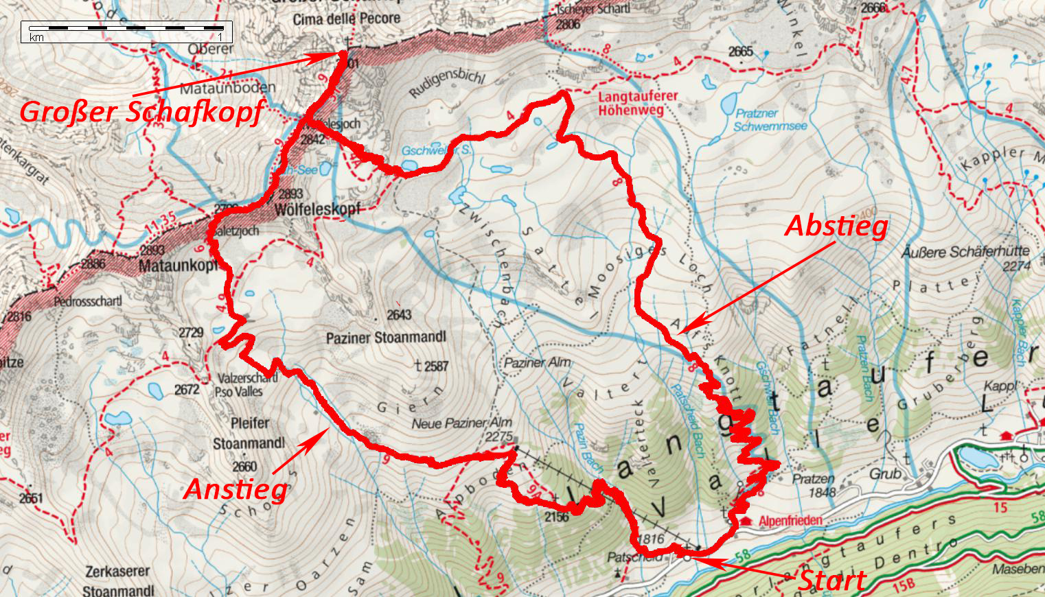 | Persönliche Bewertung | *** ca. 15 km; die Anstrengung mehr als wert! Vor allem im Herbst, wenn die Lärchen golden sind, die Nordhänge bereits mit Schnee bepulvert und der Himmel klar und wolkenlos ist. Dann trifft man auch fast niemenden mehr. |