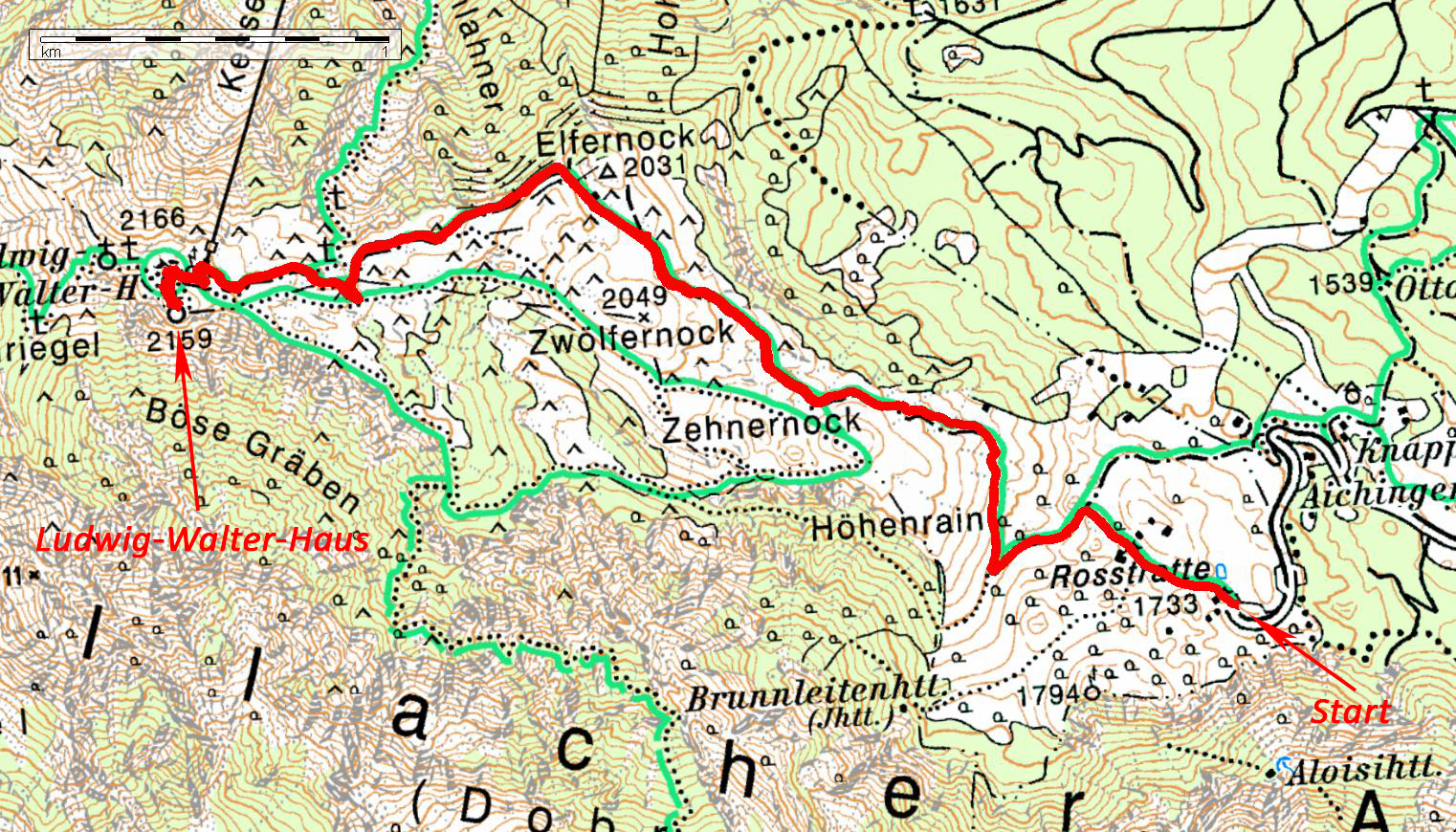 | Ausgangspunkt | Parkplatz am Ende der Villacher Alpenstrasse (1730 m) |