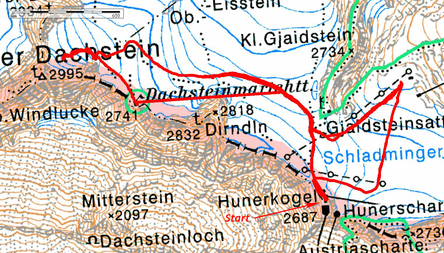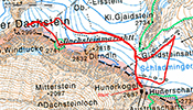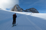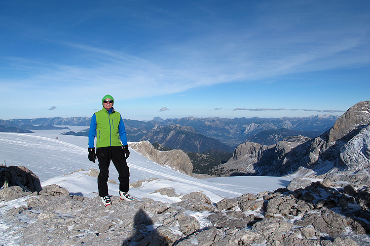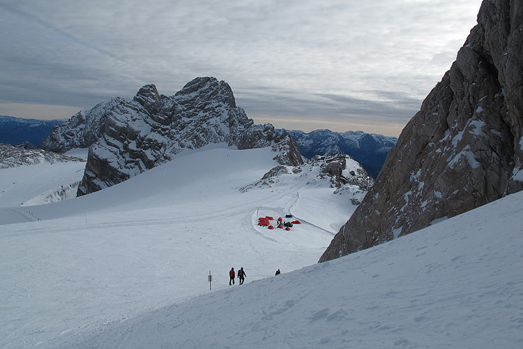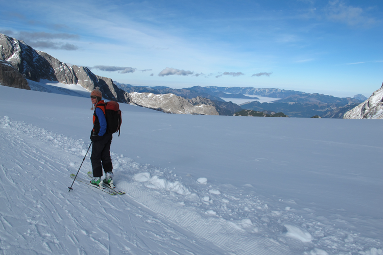 Am Freitag knapp nach acht haben wir die Unterlagen ausgefasst und sind dann über die Mautstrasse (inbegriffen in den Leistungen des Openings wie auch die Tageskarten für das Gletscherschigebiet) zur Talstation und mit der Seilbahn zur Bergstation Hunerkogel aufgefahren. Dort haben wirzu allererst Skitourenschuhe für Elisabeth ausgefassen (Scarpa Gea) und dann Schi für uns beide (Movement mit Dynafitbindung für mich und K2 Wayback mit Marker F12 für Eli) und für Eli noch die Sicherheitsausrüstung. Da Eli nicht mit einer offiziellen Schitour anfangen wollte, sind wir alleine die Piste abgefahren bis zum tiefsten Punkt (über den letzen in Betrieb befindlichen Lift hinaus; waren insgesamt nur zwei Lifte in Betrieb!). Dort angekommen wurde aufgefellt, Schischuhe geöffenet und aufgestiegen. Für Eli alles neu. Die Felle haben scheußlich geklebt, war eine ziemliche Arbeit, die Felle genau aufzubringen. Die Abfahrt hat Eli recht gut gemeistert (seit vielen Jahren nicht mehr auf Schiern gestanden) und beim Aufstieg war sie sowieso in ihrem Metier. Wir sind bis zur Bergstation aufgestiegen und dann nochmal abgefahren. Diesmal sind wir dann über den Gjaidsteinsattel auf das kleine Gipfelchen Dachsteinwarte zwischen Dirndl und Hohem Dachstein gestiegen und dann wieder abgefahren inkl. Zwischenaufstieg. Beim Abstieg haben wir noch halt beim Suchfeld von Pieps gemacht und Eli hat unter Anleitung eines Bergführers von Pieps eine Verschüttetensuche absolviert. Dann weiter bis zum tiefsten Punkt und nochmal aufgestiegen bis zur Bergstation. Dort haben wir dann das ganze Material zurückgegeben und etwas getrunken, bevor wir mit der Seilbahn abgefahren sind. Nach Dusche und Umziehen haben wir uns dann im Veranstaltungszentrum den Vortrag von Beat Kammerlander angesehen. Bei der anschließenden Verlosung leider nichts gewonnen. Wollten dann in ein Restaurant Abendessen gehen, aber Pustekuchen. Nur eine Pizzeria hatte offen und so kehrten wir zum Veranstaltungszentrum zurück und aßen dort in der Bar etwas.