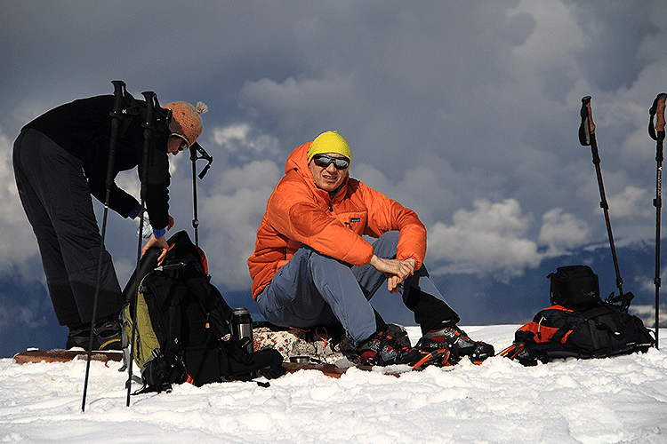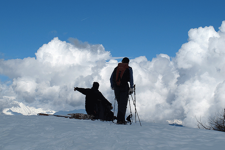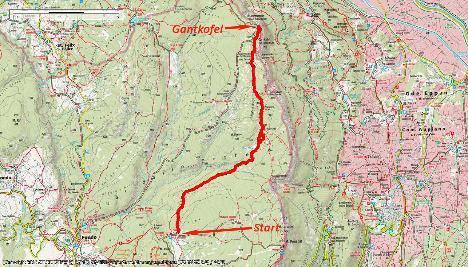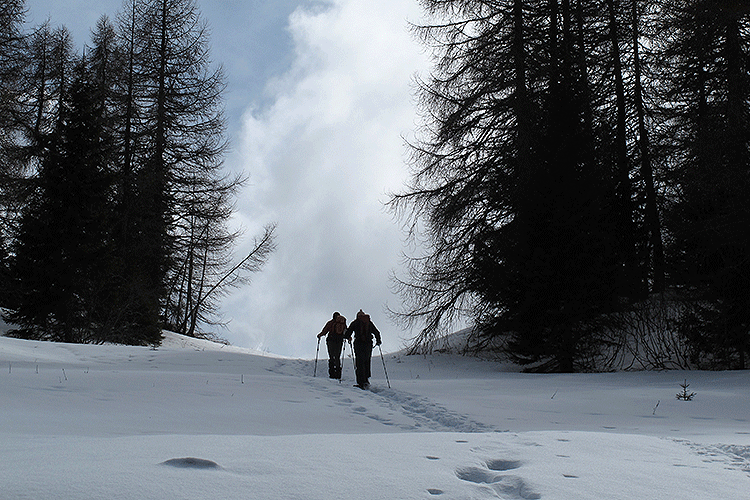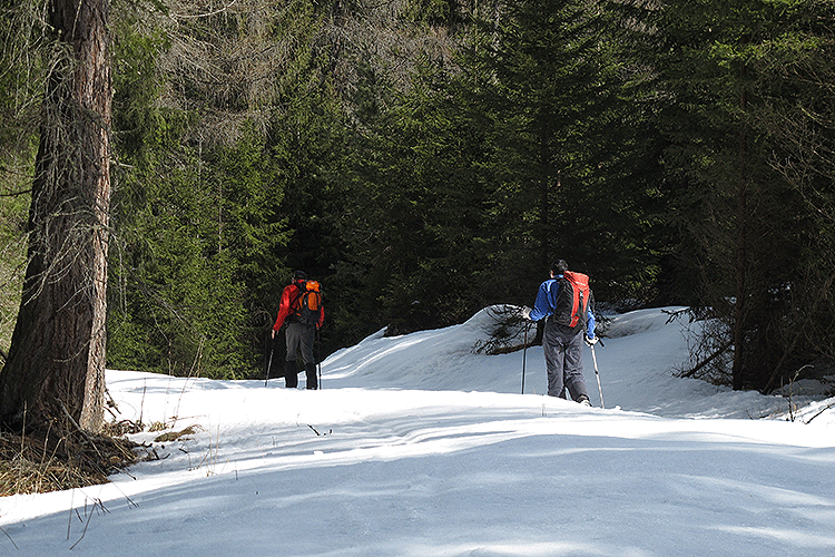 In der Früh sieht dann aber alles ganz anders aus; blauer Himmel, etwas Wolken und Sonne. Wir starten etwas später in Meran und dann um 1/4 nach 10 beim Parkplatz beim Gasthof Falchetto oberhalb von Malosco. Das Wetter hat sich etwas verschlechtert, aber ein Mix aus Wolken und zwischendurch ein wenig Sonne bleibt uns den ganzen Tag erhalten. Wir starten mit den Schneeschuhen am Rucksack, aber sobald der Weg etwas ansteigt und nicht mehr so im Schatten liegt, legen wir die Schuhe an, da wir weichen Schnee befürchten. Es geht leicht bergan, zwischendurch auch wieder Mal ein bisschen abwärts. Einmal müssen wir sogar die Schneeschuhe ablegen, da der Steig komplett für eine längere Strecke schneefrei und außerdem steinig ist. Da die Schneedecke aber bald wieder geschlossen ist und außerdem wie befürchtet ziemlich weich, kommen die Schneeschuhe wieder an die Schuhe. Kurz vor dem Gipfel geht es nochmal abwärts, aber dann sind wir nach knapp über 3 Stunden am Gipfel. Wir sind alleine am Gipfel und genießen die Aussicht über das Etschtal, aber auch Richtung Brenta und Presanella. Nach einer längeren Rast geht es an den Abstieg. Wir begegnen dabei ein paar Schneeschuhgehern, aber auch einem Paar, das mit Turnschuhen unterwegs ist und bei jedem Schritt tief einbricht. Wenn man bedenkt, dass abwärts das Einbrechen noch schlimmer sein wird, könnten sie einem leid tun, aber jeder entscheidet selbst. Der Abstieg zieht sich. Die schneefreie Stelle umgehen wir im Abstieg, so dass die Schneeschuhe bis knapp vor dem Auto an den Schuhen bleiben. Im Gasthof Falchetto genehmigen wir uns ein Getränk und sind die einzigen Gäste. Bei der Heimfahrt halten wir noch beim Milchhof von Fondo und decken uns mit Wurst, Käse und anderen Milchprodukten ein.