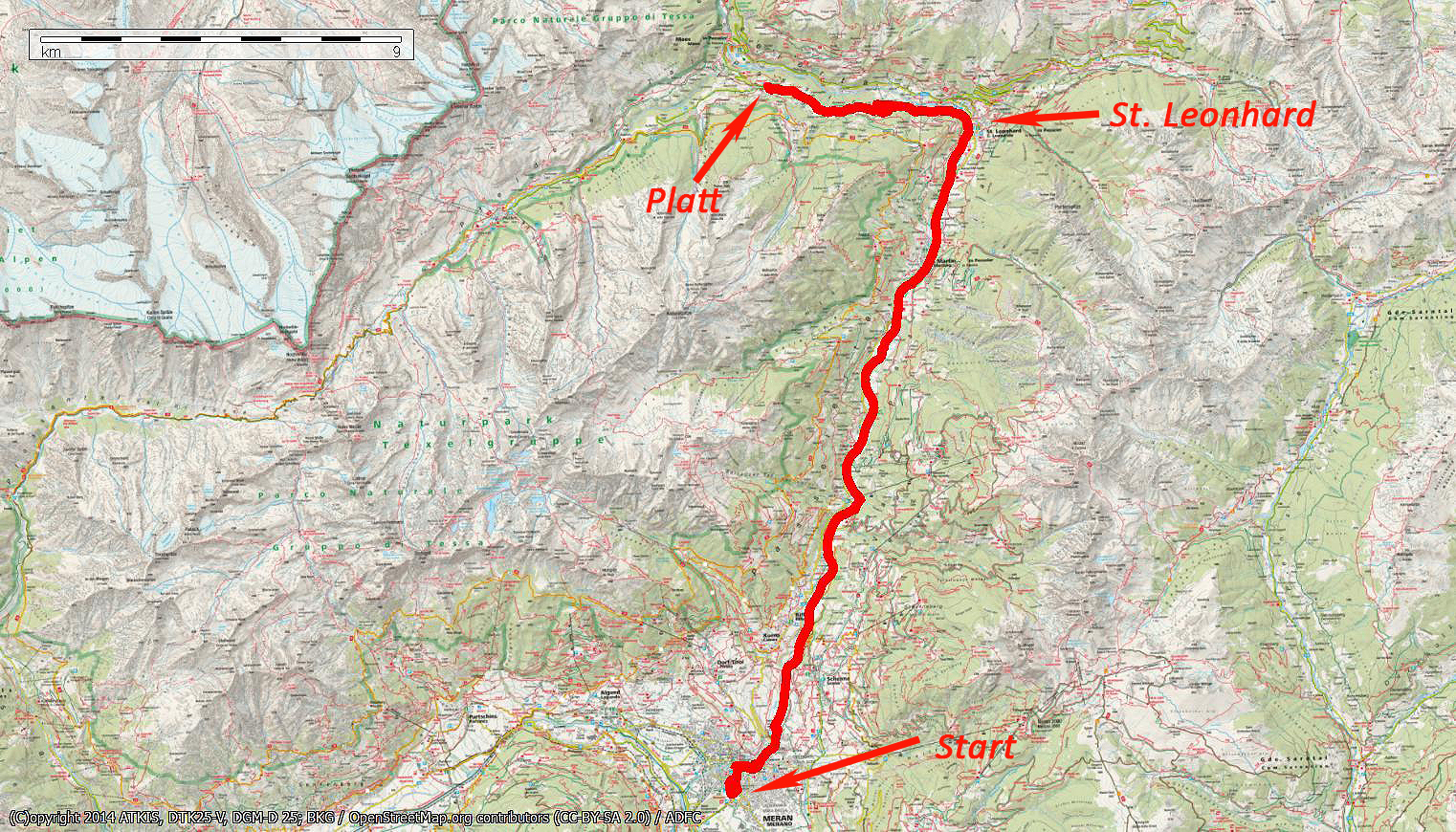 | Karten | Tabacco 011 "Meran und Umgebung" + 039 "Passeiertal" 1:25000 |