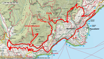 Wir sind erst spät aufgestanden und haben uns dann mit den Rädern auf den Weg gemacht, ohne größere Planung. Herausgekommen ist unsere Schiebetour; kommt davon, wenn man nur nach Karte fährt. Schiebetour deswegen, da wir zuerst einen Weg gewählt haben, der so steil war, dass keiner von uns ihn fahren konnte. Als der Weg immer steiler wurde, sind wir umgekehrt. Abwärts konnte ich ihn fahren, aber Eli mit ihrem Trekkingbike hat auch abwärts geschoben. Wieder auf der Straße angekommen, sind wird dieser gefolgt und dann über eine andere Straße nach Toscolano gefahren. Da haben wir uns dann entschlossen, noch ein bißchen weiter zu fahren und sind nach Cecina. Um nicht wieder zurück nach Toscolano zu radeln und von dort den gesamten Aufstieg zur Casa Magnico, haben wir uns entschlossen nach dem Kartenstudium einen Weg ins Valle delle Cartiere zu nehmen und von dort direkt nach Sanico zurückzukehren. Laut Karte kein Problem. Die Abfahrt ins Valle delle Cartiere war für mich teilweise zu fahren, für Elli wieder zu schieben. Im Valle angelangt und den Toscolano überquert, gings aufwärts (Weg laut Schild für alle außer Wanderer gesperrt). Anfangs war der Weg für mich zu fahren, wenn auch teilweise von Wasser überflutet, aber dann das gleiche Bild wir vormittags, schieben, schieben, schieben. Kurz vor Sanico hat sich dann noch eine Schraube von meinem Schuh verabschiedet. Schlußendlich kamen wir dann punktgenau dort an, wo wir es geplant hatten. Es wäre aber weit weniger anstrengend gewesen nach Toscolano zurück- und von dort nach Hause zu fahren. Naja, nachher ist man immer klüger. Abends haben wir dann zu Hause gegessen.