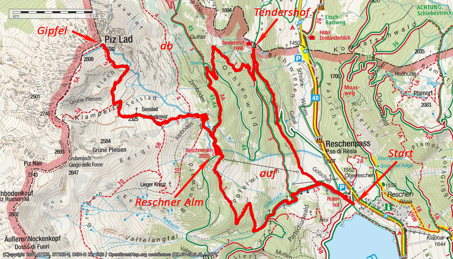 | Stützpunkt | Reschener Alm (2020 m), Tendershof (1666 m) |
