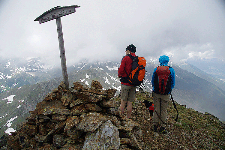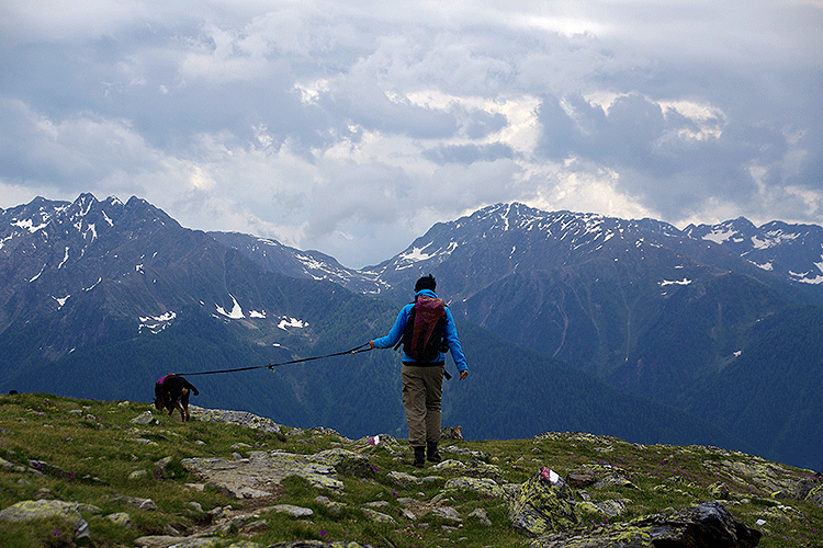 | Persönliche Bewertung | *** ca. 15,9 km. Viel begangen, trotzdem nur ein Paar auf dem Ultner Gipfel und niemand auf dem Vinschger Gipfel. Ganze Massen auf einem laut Tabaccokarte namenlosen Gipfel über dem Rontscher Joch. Die Schneefelder waren ein Spass für Willi den Hund. |