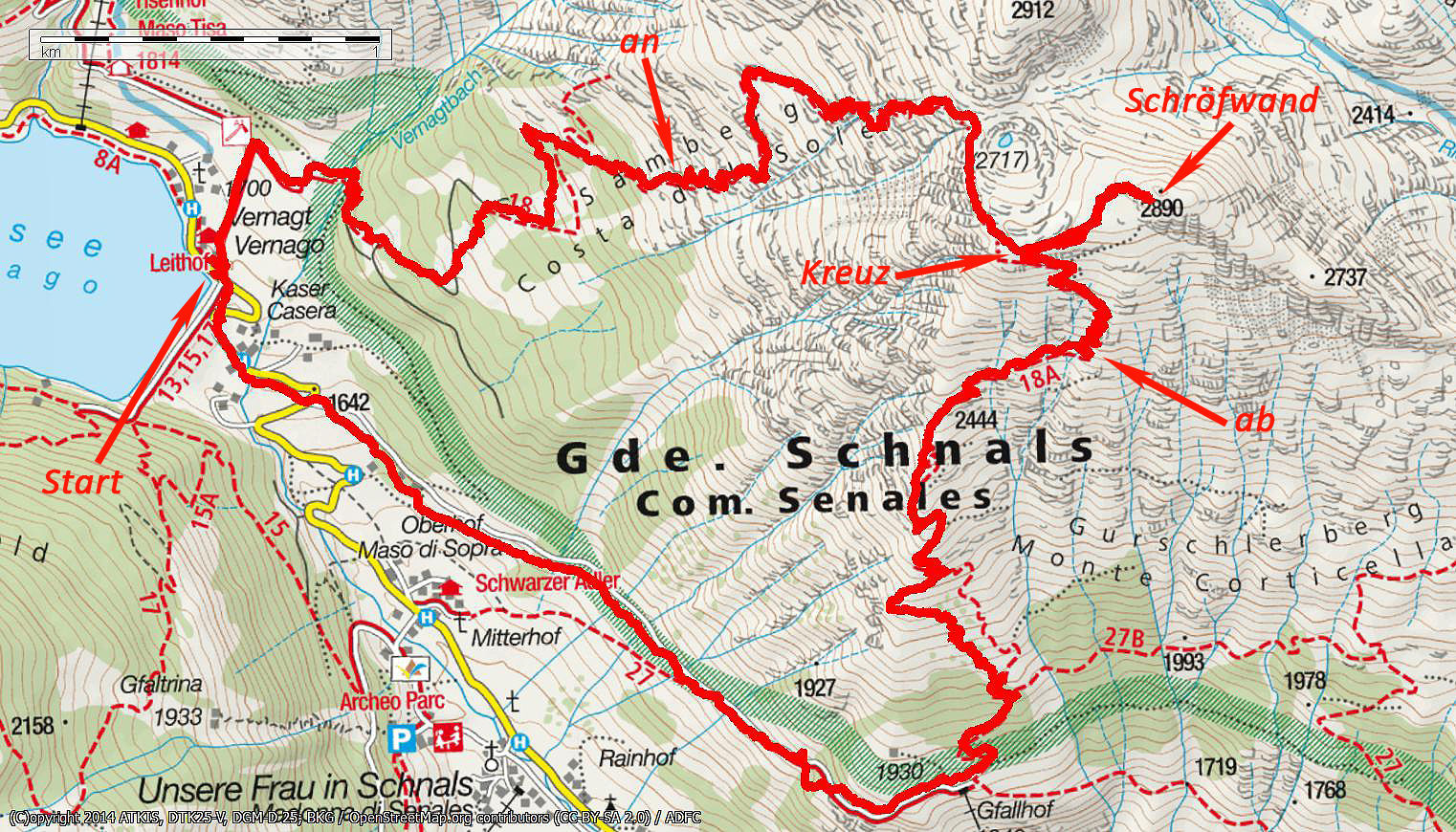 | Abstieg | ca. 1400 Hm, 3 Stunden 10 Minuten (Zeit mit Wiederaufstieg von Kreuzung Zufahrt Gfallhof) |