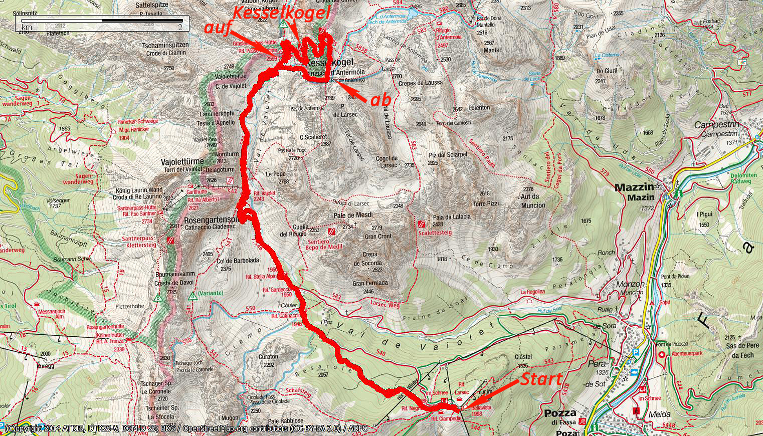 | Route | Rif. Ciampedie, Gardecciahütte, Vajolethütte, Grasleitenpaßhütte, Gipfel, Antermoiapaß und zurück |