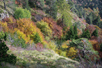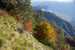 Um halb acht losgefahren und um halb neun mit der Miniseilbahn (7 Personen, vollautomatisiert, € 6,00 Hin und retour) von Mezzocorona aufgefahren. Um 20 vor neun losgegangen. Zuerst über die Wirtschaftsstrasse Richtung Malga Kraun, aber dann bald abgezweigt Richtung Malga Bodrina und Cima Roccapiana. Es geht steil aufwärts, bald überholen mich zwei Bergrenner in Strumpfhosen :-). Etwas flacher an der halbverfallenen Baita d'Aiseli, auf einer Lichtung im Wald gelegen, vorbei, bevor es dann wieder aufwärts und unter den Abhängen des Monticello durch geht. Im Auf und Ab, teilweise sehr ausgesetzt und seilgesichert, geht es mit Blick ins Nonstal dahin. Schlußendlich ohne größeren Höhenverlust kommt man an der Malga Bodrina vorbei, die ein paar Minuten vom Weg entfernt liegt. An der Ostseite des Kammes, zuerst durch Mischwald und dann durch Latschengebüsch, geht es meist aufwärts. Hier auf der Schattenseite liegt teilweise noch Schnee vom letzten Schneefall. Kurz vor dem Gipfel treffe ich noch eine Gruppe von Jägern mit zwei Hunden und am Gipfel selbst treffe ich den Wanderer, der mit mir aufgefahren und dann knapp vor mir losgegangen ist. Er macht für mich ein paar Fotos und macht sich dann sofort an den Abstieg Richtung Malga Kraun. Ich lasse mir mehr Zeit und esse etwas, genieße den schwachen, duch Schleierwolken getrübten Sonnenschein und lasse mich auch durch den Wind nicht antreiben. Mit dem Fernglas sehe ich mir die schneebedeckte Brenta und die Adamello-Presanella-Gruppe an. Dann mache auch ich mich an den Abstieg zur Malga Kraun, die vom Gipfel aus schön sichtbar ist. Es geht ziemlich steil, wenn auch in Serpentinen abwärts. Ringsum ist bereits viel in den roten und gelben Herbstfarben, so dass ich immer wieder stehen bleibe, um zu fotografieren. Zwei schnelle Damen überholen mich. Weiter unten führt der Weg wie auch schon im Aufstieg durch wunderschönen Laubwald. Der Weg ist teilweise nur durch die Markierungen an den Bäumen sichtbar, da der Boden dick mit abgefallenem Laub bedeckt ist (gleich wie letzten Sonntag). An der Malga Kraun vorbei, geht es dann über den Wirtschaftsweg zurück zur Seilbahn. Auch da überholen mich nochmals zwei schnelle Damen. Auf den letzten Metern nehme ich dann unwillentlich einen kleinen Umweg, komme aber genau zurecht zur Abfahrt um dreiviertel drei. Wie gesagt alles automatisiert. Die Schranke lässt kurz vor der Abfahrtszeit genau sieben Personen durch. Mit Blick auf das Etschtal und Mezzocorona geht die Bahn steil, steil hinunter.