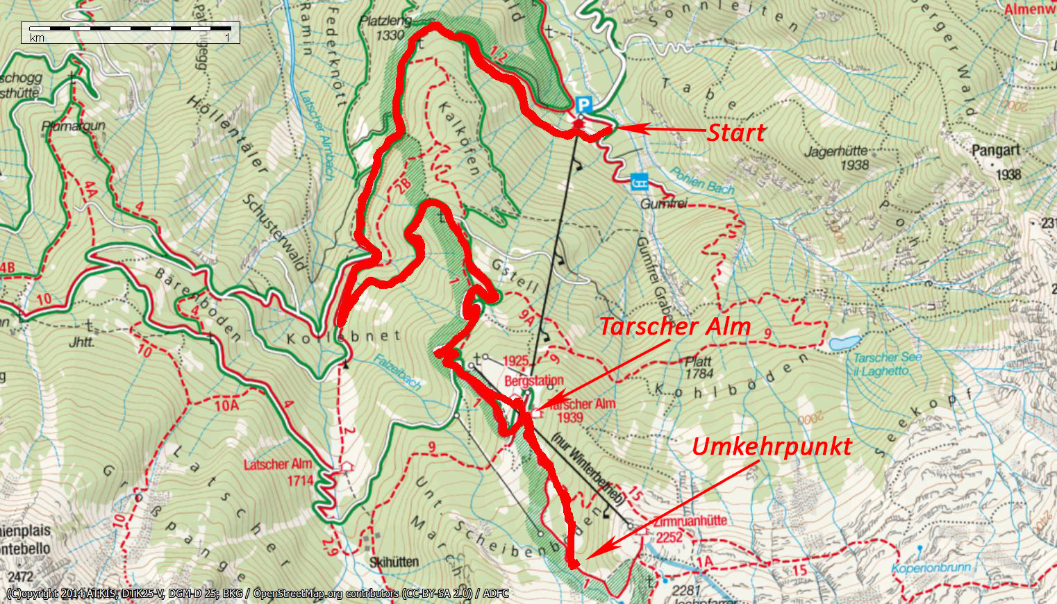 | Persönliche Bewertung | *** ca. 14 km; wunderbarer Schnee, fast unverspurt, ideale Schitour für hohe Lawinenwarnstufe, oberer Teil im aufgelassenen Schigebiet, kann eventuell bis zur Zirmraunhütte (frühere Bergstation) oder dem Tarscher Joch verlängert werden; Abfahrt im früheren Schigebiet toll, auf dem Zustiegsweg nicht so toll. |