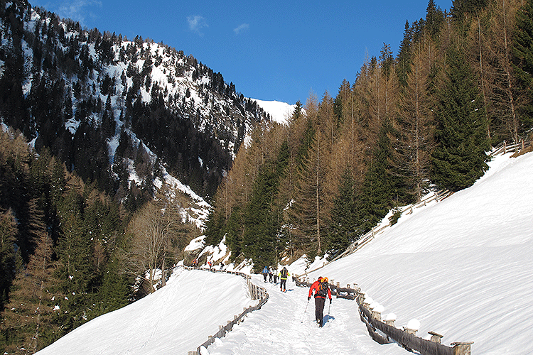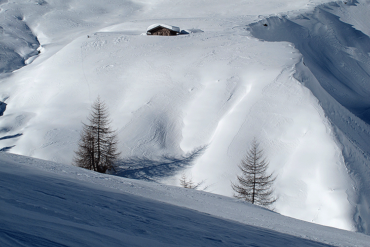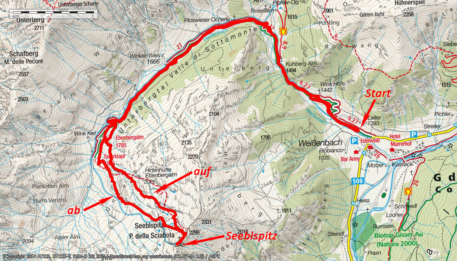 Um knapp nach 9 vom Parkplatz am Anfang der Straße zu den Winkhöfen los; stehen schon einige Autos geparkt, schnappen uns einen der letzten Plätze. Treffe zufällig den Vater von Christoph Plungger, den ich seit über 10 Jahren nicht mehr gesehen habe. Er ist mit Frau und zwei Bergführern unterwegs, einer davon Ulrich Kössler, der heuer alle Touren im Sarntal abgeht, für einen neuen Schitourenführer, der im nächsten Jahr erscheinen soll. Nach ein paar Hundert Metern mit den Schi auf der Schulter, können diese endlich angeschnallt werden und es geht direkt zu den Winkhöfen. Zwischen diesen durch erreichen wir den Wirtschaftsweg, der ins Unterbergtal führt. Nur wenig Höhe gewinnend geht es auf diesem Weg bis zur Ebenperghütte. Bis hierher brauchen wir fast 2 Stunden und haben erst 450 Hm gemacht. Die Geher vor uns sind alle schneller als wir, einzig die Schneeschuhgeher mit Hund haben unser Tempo. Ab der Hütte geht es aufwärts. Zuerst in Spitzkehren, dann etwas flacher, dann einen steileren Graben, der eingeblasen ausschaut, wieder in Spitzkehren. Es ist laut gestrigem Lawinenlagebericht ein 2er ausgegeben und dafür geht der Graben. Aber der LLB ist nicht mehr aktuell; wie wir nach der Rückkehr sehen, wurde die Gefahrenstufe für das ganze Wochenende auf 3 angehoben; wahrscheinlich nachdem mehrere Lawinen in Südtirol abgegangen sind. Wie wir nach der Rückkehr am Parkplatz erfahren, hat ein Italiener der den Graben abgefahren ist, ein Schneebrett ausgelöst. Soviel zu der Verbesserung des südtiroler LLB, am Freitagnachmittag für das gesamte Wochenende bis Montagnachmittag auszugeben, gegenüber früher als er am Samstag in der Früh um 8 bis Montagmorgen ausgegeben wurde. Ober dem Graben geht es erstmals wieder eher flach bis zum nächsten steileren Stück. Nach diesem geht's durch eine Mulde und von links kommt eine bessere Spur herauf. Nun nur mehr den Gipfelhang bis zum Kamm und entlang, besser auf diesem, bis zum Gipfel. Die ersten sind schon wieder abgefahren (die Italiener), die anderen fahren so langsam ebenfalls ab, während wir noch rasten und essen und die Aussicht genießen. Am Gipfel ist es weniger windig als im Unterbergtal. Nach einiger Zeit fahren bzw. steigen auch wir ab. Es kommen immer wieder einige andere Schitourengeher zum Gipfel. Wir folgen bei der Abfahrt der besseren Aufstiegspur; auch die meisten anderen sind dort abgefahren. Der Schnee ist zwischendurch nicht so schlecht, dann wieder brüchig, aber insgesamt geht's nicht schlecht. Von der Ebenpergerhütte auf dem Wirtschaftsweg bin ich dann relativ schnell beim Auto, sogar mit den Schi an den Füßen. Bernd braucht geringfügig länger auf seinen Schneeschuhen.
