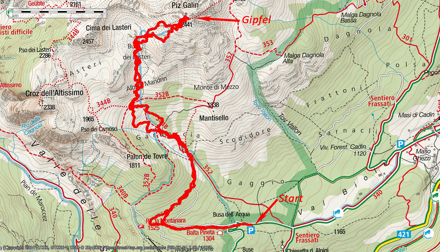 | Ausgangspunkt | Parkplatz in der Nähe der Baita Pineta (1250 m) |