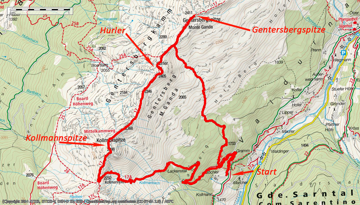 | Persönliche Bewertung | *** 13,65 km, nette Tour, zentral gelegen, daher Aussicht auf alle Sarner Berge rundum, Abstieg vom Tiefpunkt zwischen Gentersbergspitz und Hurler weglos, Latschen, im Wald dann alter Steig/Traktorweg. |