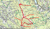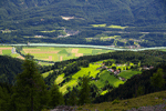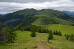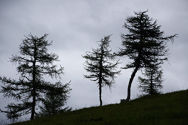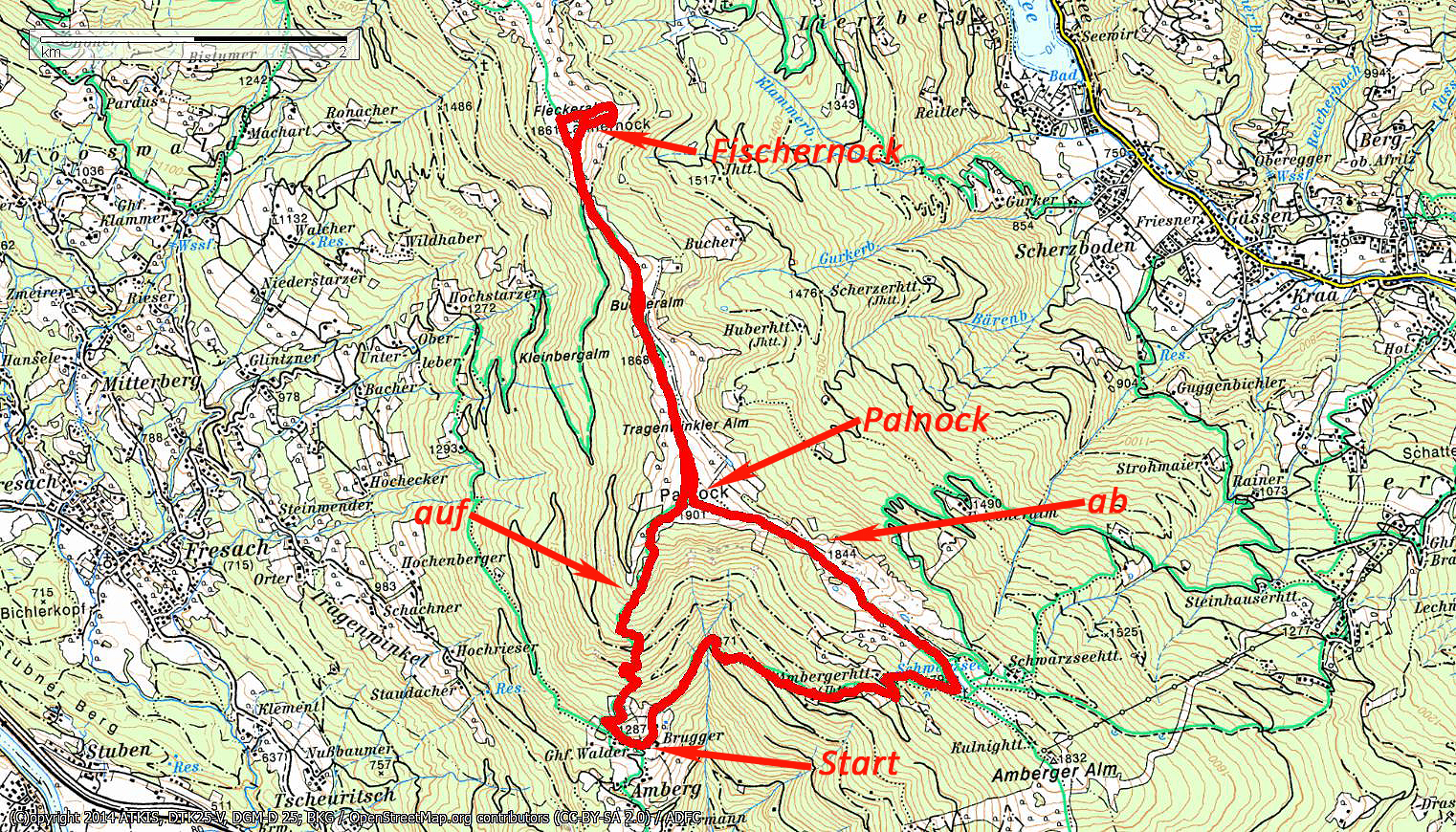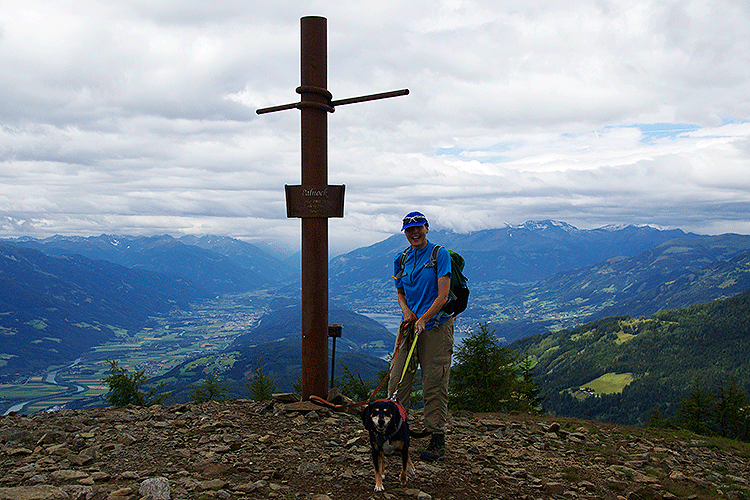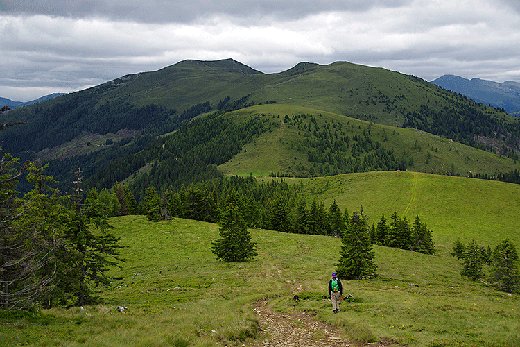 Lange geschlafen, nach dem wir am Vortag erst um Mitternacht angekommen sind. Wir suchen wie üblich ein bisschen, bevor wir den richtigen Weg zum Ausgangspunkt gefunden haben. Um kurz nach 12 starten wir beim Gasthof Walder; letztes Mal waren wir von Weißenstein bis hierher zu Fuß aufgestiegen. Hinter dem Gasthof geht's kurz am Rand einer Wiese aufwärts, dann sind wir im Wald. Wie hier üblich steigt der Weg steil an; zwischendurch queren wir Wirtschaftswege, der Steig selbst geht gerade aufwärts. Nach eineinviertel Stunde sind wir am Gipfel des Palnock; da Richtung Norden der waldfreie Kamm auf und ab über verschiedene Nocken bis zum Mirnock geht, beschließen wir dem Kamm zu folgen. Die Weideflächen mit den Kuhherden sind nur durch Holzzäune getrennt, auf der Karte haben sie alle Namen (Tragenwinkler Alm, Bucheralm, Fleckeralm). Ab der Bucheralm lassen wir Willi frei laufen, was dieser nach kurzer Zeit beim Aufstieg zum Lahnernock ausnützt und ausbüxt. Eli folgt ihm als erstes und ich dann auch, aber bald (praktisch sofort) haben wir ihn aus den Augen verloren. Wir rufen und irren herum, aber nichts von Willi zu sehen oder hören. Schlußendlich taucht er dann wieder auf. Wir nehmen ihn nun wieder an die Leine und steigen alles, was wir auf der Suche nach Willi abgestiegen sind, wieder auf und noch ein paar Meter mehr bis wir am Gipfel des Lahnernock sind. Gipfel ist ein bißchen hochtraben ausgedrückt, es ist der höchste Punkt des runden Nocks. Die nächsten zwei Gipfel (Lierzberger Alpenspitz und Rindernock) sind zum Greifen nach, aber die Such nach Willi hat Zeit gekostet, so kehren wir um. Zurück am Palnock gehen wir Richtung Südosten zum Schwarzsee (kleine Lacke) und dann tauchen wir wieder in den Wald ein. An der Ambergerhütte, einer Jägerhütte, vorbei kommen wir immer weiter hinunter und sind bald am Bruggerhof, von dem es die letzten Meter aufwärts zum Gasthof Walder geht.