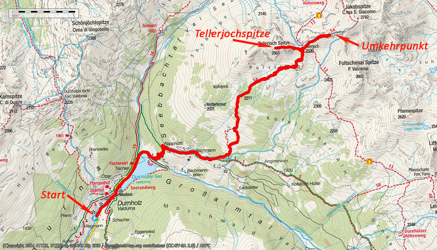 Da es erst vor kurzem einiges geschneit hat in der Höhe, kamen nur südseitige Anstiege in Frage. Die erste Wahl in Ulten (Rontscher Berg, Muteggrub) wurde verworfen, schlußendlich viel die Wahl auf die Jakobsspitze in Durnholz. Ich war schon zu Fuß oben (durch das Seebachtal und die Flaggerscharte, 1986) und mit den Schiern (immer durch das Seebachtal, aber mit eher direktem Anstieg), aber noch nie über die Südseite.
