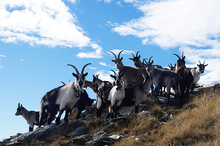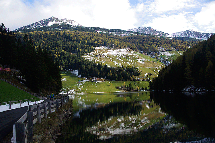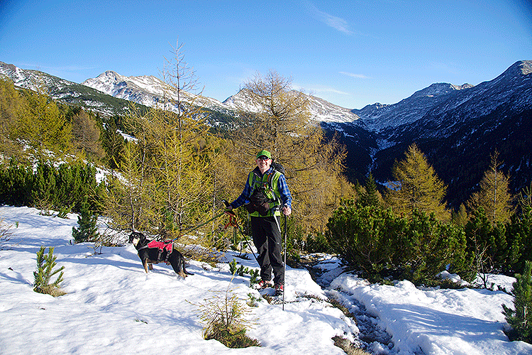 Um kurz vor neun sind wir vom Parkplatz vor dem Dorf gestartet; um diese Jahreszeit hätten wir wahrscheinlich auch bis zum Fischwirt fahren und dort parken können, aber wir haben uns an das Verbotsschild gehalten. Also auf der Teerstraße um den halben See, dann am Seeberhof vorbei und steil durch den Wald aufwärts. Auf einer weiteren Hofzufahrt eben taleinwärts und hinter dem Bachmannhof den markierten Steig durch den Lärchenwald. Es liegt Schnee, aber er stellt noch kein Problem dar. Auf ca. 1900 m lichtet sich der Wald und der Latschengürtel beginnt. Hier liegt der Schnee knietief und ist an der Oberfläche angeharscht. Spuren ist angesagt. Der Schweiß rinnt in Strömen; bei jedem Schritt hält der Schnee einen Augenblick, bevor ich dann einbreche. Kostet Kraft. Nach 300 Hm hat die Schinderei ein Ende. Oberhalb des Latschengürtels liegt zwar auch Schnee, aber nur in den Mulden. Die Rücken sind schneefrei und der Aufstieg zum Tellerjoch erfolgt direkt auf dem schneefreien Steig. Wir hören Tierglocken und entdecken in der Flanke der Tellerjochspitze einige Punkte, können aber nicht unterscheiden, ob es sich um Schafe oder Ziegen handelt. Ein Stück unter uns sehen wir vier Jugendliche, die unserer Aufstiegsspur gefolgt sind und nach den Tieren Ausschau halten. Bald sind wir am Tellerjoch und folgen der Markierung Richtung Jakobsspitze. Nach dem ersten Aufschwung mü+ssen abschüssige Schneefelder gequert werden und als dann auch noch nasse Platten zu queren sind, brechen wir die Besteigung ab. Auf den Platten hat Willi einfach zu viele Probleme. Nachdem wir an der Jakobsspitze auf 100 Hm unter dem Gipfel (in Luftlinie wären es wahrscheinlich noch 200 - 300 m gewesen) umgekehrt sind, steigen wir vom Tellerjoch auf die Tellerjochspitze. Am Gipfel angekommen suchen wir einen Moment den höchsten Punkt, da er nicht eindeutig feststellbar ist, gehen wir die drei Erhebungen alle ab. Das Kreuz ist viel tiefer auf einem Vorgipfel. Kurz unterhalb des Gipfels rasten wir in einer windgeschützten Mulde und marenden. Die Ziegen (sind jetzt nahe genug dies festzustellen) haben uns entdeckt und nähern sich uns. Die ganze Herde schiebt sich immer näher, mit Blick auf unsere Brote. Willi fühlt sich nicht so wohl und bellt die Ziegen wie verrückt an. Dies schreckt sie soweit ab, dass sie 5-6 m Abstand halten. Sie kommen zwar nicht mehr näher, aber schauen uns beinahe in den Magen hinab, so genau verfolgen sie, wie wir essen. Wir lassen uns nicht aus der Ruhe bringen (Ausnahme Willi) und gehen erst weiter, als wir alles aufgegessen haben. Im Abstieg umgehen wir den kleinen Gegenanstieg zum Joch und queren direkt zum Aufstiegsteig. Bald haben wir den Latschengürtel erreicht, aber der Abstieg ist einfacher, auch da die vier Jugendlichen die Spur etwas ausgetreten haben. Als wir den See erreicht haben, ist die Sonne schon hinter den Bergen verschwunden, auch wenn es noch hell ist. Beim Fischerwirt gönnen wir uns Bier und Kaffee, bevor am See entlang zum Auto schlendern.