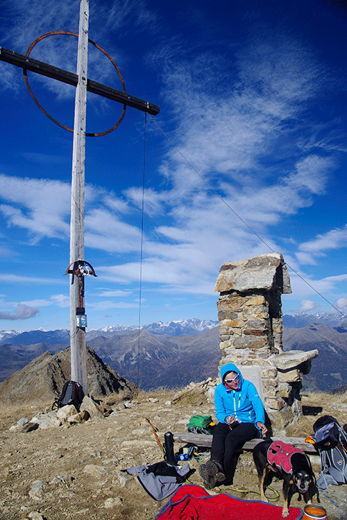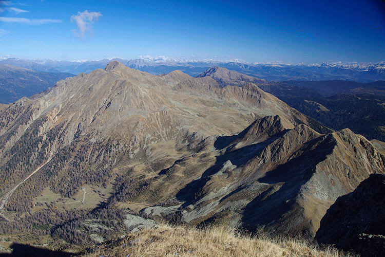 Auf dem Forstweg begegnen wir dann trotz Sonntag einem Riesentraktor mit Anhänger, der die gefällten Bäume abtransportiert. Mit leichtem Höhenverlust mündet die Forststrasse nach einer Weile bei der Pont da Vat in den Wirtschaftsweg zur Malga Val/Rifugio Maddalene ein. Dieser ist betoniert und elendssteil. Wir gewinnen dadurch schnell an Höhe und erreichen in einer Dreiviertelstunde die geschlossene Alm. Die Markierungen und schwache Steigspuren leiten uns in angenehmer Steigungzum Korjöchl (Passo Termen del Val). Hierher kommt man auch durch das Einertal von der ultner Seite. In leichter Steigung quert der Steig nun die Hänge, bevor er wieder sehr steil in Serpentinen geradewegs zum Gipfel führt. Am Gipfel treffen wir die ersten anderen Wanderer, ein Paar, das von Lanza aus aufgestiegen ist und nunmehr unseren Aufstiegsweg absteigt. In kurzen Abständen treffen nun weitere Wanderer eine, insgesamt noch 8, 6 davon von der nonsberger Seite (einer im Übergang vom Stübele, ein Bergrenner) und ein Paar von der ultner Seite. Wir alle genießen den wunderschönen Spätherbsttag am Gipfel. Erst nach einer Stunde machen wir uns an den Abstieg. Anfangs noch im Sonnenschein, aber schon bald im Schatten des Monte Lavazzaie. Der letzte Teil von der Pont del Vat bis zum Auto zieht sich wie üblich. Nach insgesamt 6 1/2 Stunden reiner Gehzeit sind wir wieder beim Auto.