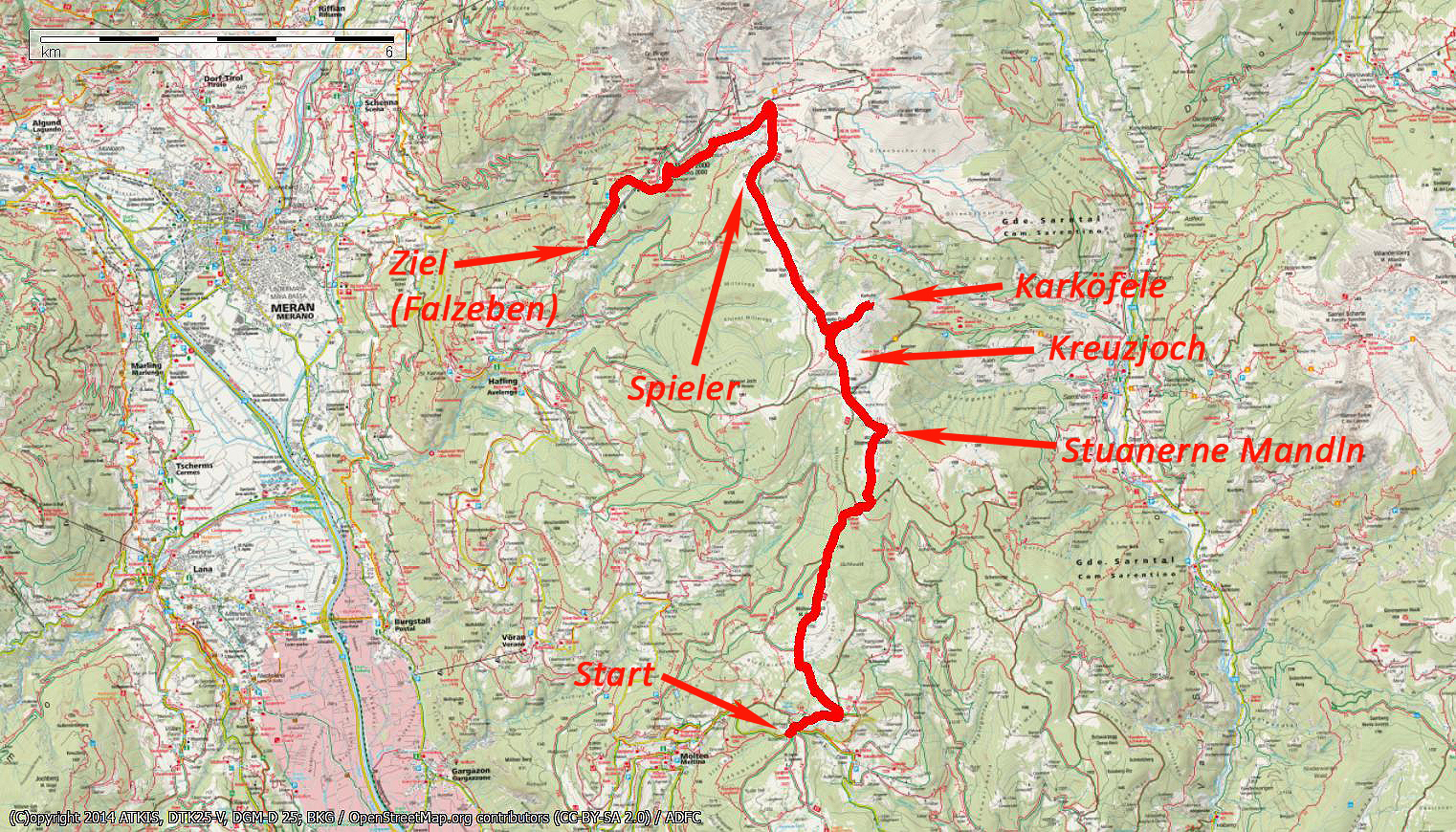 | Aufstieg | ca. 900 Hm, gesamte Strecke 6 Stunden 45 Minuten, davon ca. 2 Stunden bis zu den Stoanarnen Mandln, weitere 1 Stunde 30 Minuten bis zum Karköfele, 1 Stunde 30 Minuten bis zum Spieler und dann noch 1 Stunde 45 Minuten bis zum Parkplatz in Falzeben |