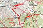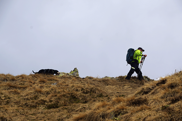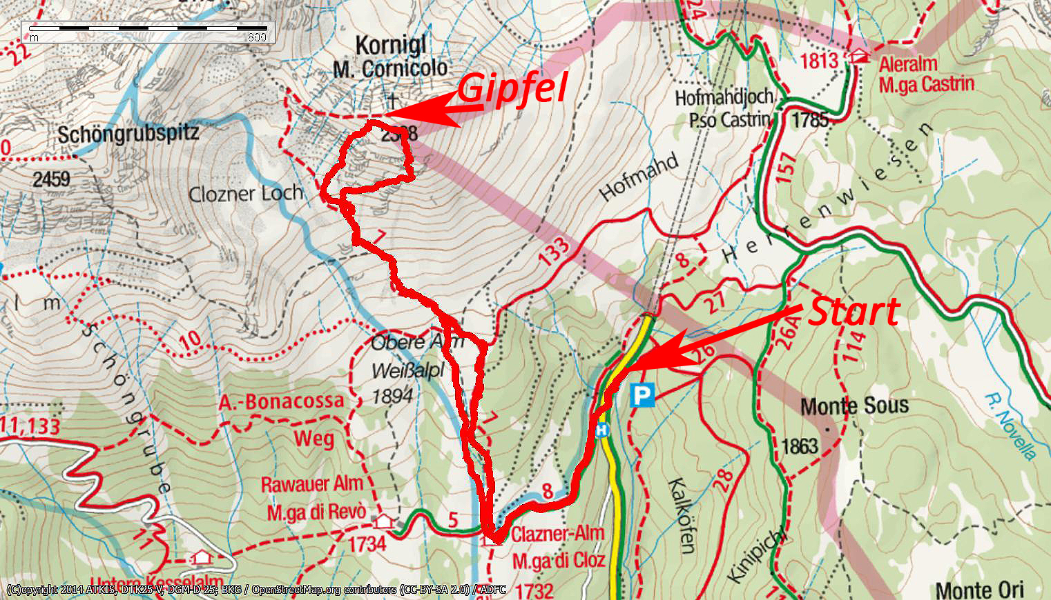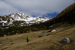 Um halb zehn sind wir beim oberen, dem ersten, Parkplatz nach dem Scheiteltunnel gestartet; außer unserem war kein Auto da. Gemütlich geht's zur Clozalm, die bereits jeweils am Wochenende geöffnet ist. Willi zieht nach allen Richtungen und es stört ihn überhaupt nicht, dass sein Herrchen andere Absichten als er hat. Weiter zur Oberen Clozalm, die immer noch das eingedrückte Dach und eingebrochenen Mauern hat. Weiter Richtung Kessel. Während die reinen Südwestseiten komplett ausgeapert sind, liegt in den anders ausgerichteten Hängen noch Schnee. Die Idee eventuell auf die Schöngrubspitze und weiter zur Hochwarth zu gehen, verwerfen wir sofort. Jetzt sind komplett oberhalb der Waldgrenze und ich kann Willi laufen lassen; das Gehen wird sofort einfacher. Bernd beschließt nicht dem markierten Steig zu folgen, sondern direkt die Rinne aufzusteigen, die knapp links vom Gipfel auf den Rücken führt. Es wird nun auch ohne Willi anstrengen; steil, zwischendurch erdig (bei jedem Schritt ein bißchen zurückrutschen) und man muss die Füße kontrolliert auf das zum Glück trockene Altgras setzen. Wir erreichen den Kamm und dann sind es nur noch ein paar Meter zum Kreuz.. Wir machen es uns bequem; es ist angenehm, nur zwischendurch kommt ein bißchen Wind auf. Willi untersucht die Gegend und verabschiedet sich außer Sicht, kommt aber nach einiger Zeit wieder zurück. Bernd und ich haben uns den Weg auf den Spitzner (oder Spitzigen, weiß nicht, welches der richtige Namen ist) Kornigl angesehen. Wäre machbar, aber in den steilsten Stücken weicht man ein bißchen in die Ostflanke aus und dort liegt noch Schnee. Wir verzichten. Gemütlich packen wir zusammen und starten direkt in Falllinie vom Gipfel nach unten. Auf halber Höhe führt der schwache Steig dann nach rechts (ich weiß, solche Richtungsangaben sind nicht sehr professionell, aber sei's drum) und schlußendlich kommen wir zum markierten Steig zurück. Bis zur Clozalm darf Willi frei laufen. Auf der Alm gönnen wir uns ein Hefe, bevor wir zum Auto zurückgehen.