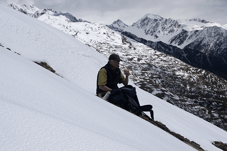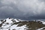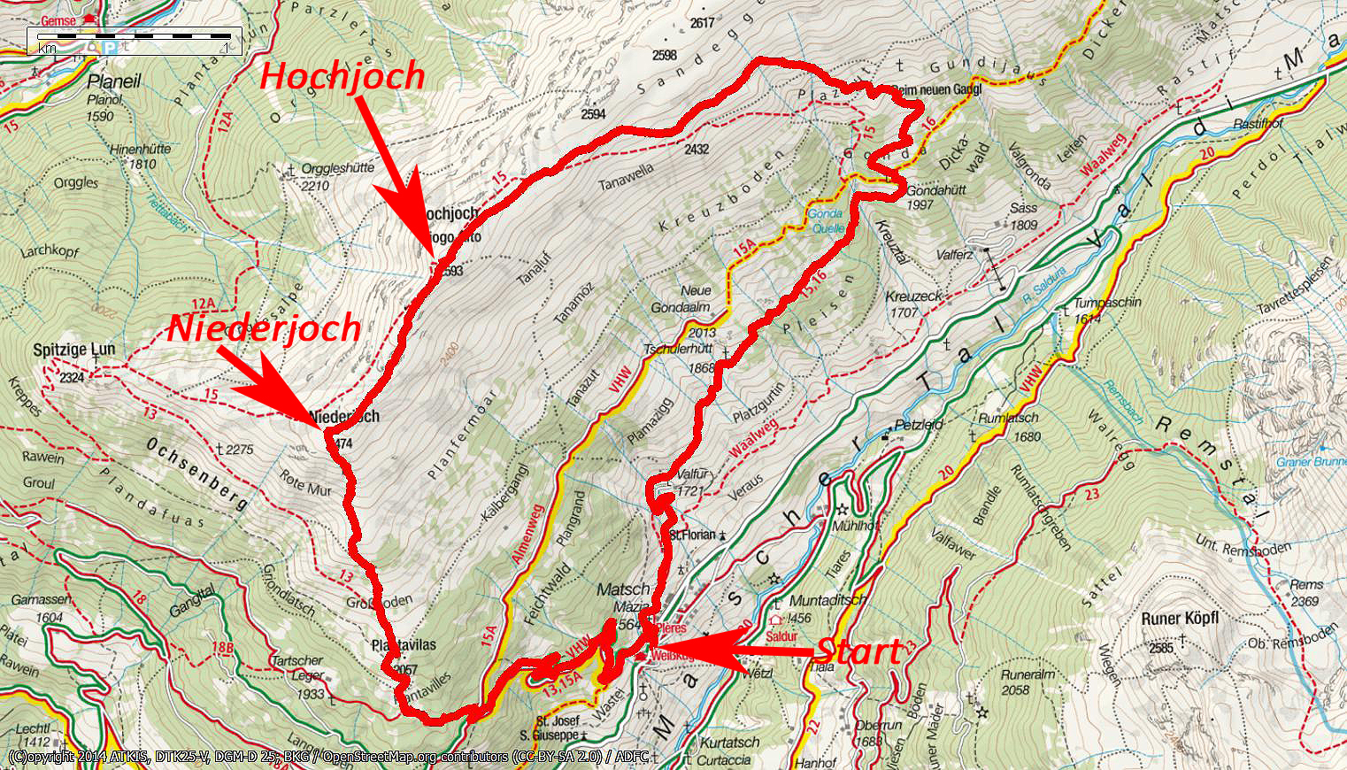Um halb neun in Meran los und nach einem Morgenkaffee in Matsch um 10 vor 10 los. Die Gasthäuser in den Vinschger Seitentälern sind der Zeit immer einen Schritt voraus: als vor Jahren überall in Meran der Kaffee noch für ,10 Euro bis 1,20 Euro zu haben war, hat er im Gasthaus in Planeil bereits 1,30 Euro gekostet; diesmal in Matsch kostete er 1,40 Euro, in Meran immer noch 1,30 Euro. Wir folgen kurz der Zufahrtsstraße zum Hof Valfur und nehmen dann ab der letzten Biegung vor dem Hof den Steig mit der Markierung 15 oder 16. Die Nummerierung löst sich ab, erst ab der Gondahütt wird klar, dass die 15 Richtung Kamm und damit Hochjoch führt, während die 16 als Matscher Höhenweg Richtung Kalte Wiesen führt. Willi kann außer in den bewaldeten Teilen frei laufen und genießt dies sehr. Meist ist er mit Bernd voraus und bleibt nur zwischendurch stehen, um zu sehen, ob ich nachkomme. Ab Gondahütt geht der Steig teilweise steil Richtung Kamm. Ca. 200 Hm unter dem Kamm dreht der Steig taulaus und führt in geringerer Steigung im talaus mit einem kleinen Höhenverlust und Gegenanstieg bis zum Gipfel. Dieser Wegverlauf erklärt auch, warum ich den Weg im Abstieg immer verloren habe. Ich war nie bereit soweit talein zu gehen und bin daher immer viel früher weglos Richtung Neuer Gondaalm, die ja weithin sichtbar ist, abgestiegen. Am Kamm bläst ganz nett der Wind und wenn die Sonne von Wolken verdeckt ist, ist es gleich ungemütlich. Wir steigen daher sofort ein paar Meter ab und suchen uns ein windgeschütztes Plätzchen, an dem wir es uns gemütlich machen. Willi ist das Berggehen auch nicht mehr so gewöhnt und frißt sein Futter im Liegen. Nach ausgiebiger Rast beginne wir den Abstieg Richtung Niederjoch. Das Paar, das im Aufstieg zum Hochjoch schien, ist in der Zwischenzeit umgekehrt und geht schlußendlich Richtung Spitzige Lun. Sie haben sich wahrscheinlich vom Schnee in der Schattenseite abbringen lassen. Wir selbst gehen bequem am Kamm und berühren kaum die Schneefelder, wie schon im Aufstieg. Vom Niederjoch aus gehen wir direkt Richtung Matsch ohne am Kreuz, das etwas abseits und niedriger steht, vorbei zu kommen. Willi verlässt uns kurz, um verschiedene Murmeltierbaue in der Südflanke zu kontrollieren, kommt aber bald wieder. Als wir uns der Waldgrenze nähern, erinnern wir uns kurz an eine Tour zu Allerheiligen vor 20 Jahren. Wir sind damals am Abend aufgestiegen und haben an der Waldgrenze biwackiert. Am Morgen waren unsere Schlafsäcke von einer dünnen Schneeschicht bedeckt. Wir wollten damals weiter über den Jafant und nochmals biwackieren (die Biwacks waren nur Selbstzweck), aber das Wetter hat uns dann einen Strich durch die Rechnung gemacht. Es hat zu Regnen und Schneien begonnen und so haben wir nach dem Hochjoch die Tour abgebrochen und sind im Regen zurück zum Auto. Auf dem Forstweg geht es dann langsam Richtung Matsch. Zwei Mountainbiker in der Auffahrt und ein Tiertransporter auf dem Rückweg von der Gondaalm begegnen uns. Nach insgesamt 5 Stunden und knapp über 13 km sind wir wieder am Auto.