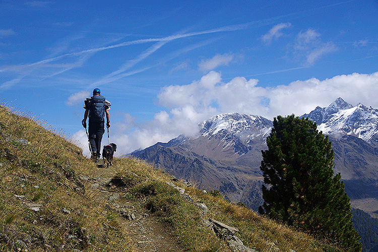 Die Wettervorsage war nicht so schlecht, daher starten wir erst relativ spät. Nach einem eher teuren Kaffee (€ 1,50, aber wie wir bereits füher die Erfahrung gemacht haben, sind sie in den Tälern den Städten bei der Preisgestaltung oft weit voraus) gehen wir um 20 vor 10 los. Willi ist an der Leine und er benimmt sich recht manierlich. Zuerst über die Forststrasse, aber bald geht die Markierung und der Steig ab und es geht aufwärts. Das Wetter ist angenehm zum Gehen und bei der Peder-Stieralm haben wir die Gruppe, die vor uns gestartet ist, als wir zum Kaffeetrinken gingen, eingeholt. Wie wir später bemerken, geht die Gruppe aber nicht auf die Kalfanwand. Wir gehen gleichmäßig weiter und sobald wir die Waldgrenze hinter uns gelassen habe, kommt Willi von der Leine. Bald pfeifen die Murmel und Willi geht auf Wanderschaft in Gehrichtung rechts. Ich warte und nachdem ein Murmel links von mir pfeift, taucht auch Willi wieder auf. Ich nehme ihn für ein paar Minuten an die Leine und dann darf er wieder frei laufen. Ab da erkundet er zwar zwischendurch die Gegend, ist aber immer bald wieder bei uns. Ein Paar Deutsche, die anfangs weit vor uns sind, holen wir knapp unter dem Gipfel ein; am Gipfel selbst sind noch zwei Wanderer. Wir suchen uns knapp unter dem Gipfel ein windgeschütztes Plätzchen und lassen es uns gut gehen. Jetzt steigen auch Nebel aus dem Tal und so ist der Blick auf die Lyfispitze nur zwischendurch frei. In diesen Momenten sehen wir, dass das neue Kreuz aufgestellt ist und auch ein Wanderer am Gipfel. Richtung Osten steht eine Föhnmauer aus der der König zwischendurch auftaucht. Nach ausgiebiger Rast beginnen wir mit dem Abstieg. Anfangs noch windig, wird es weiter unten wieder wärmer und auch windstiller, so dass die Softshell wieder im Rucksack verschwindet. Nach zwei Stunden gemütlichem Abstiegs sind wir wieder beim Auto. Willi war beim Abstieg sehr brav und hat immer wieder auf uns gewartet; er mit seinem Vierpfotenantrieb ist immer noch schneller als wir. Mein Knie hat nur einmal Mucken gemacht, als mir plötzlich ein Schmerz wie ein Messerstich ins Knie stach, aber nach einem bißchen Massieren und 100 m humpeln, verschwand der Schmerz so schnell wie er aufgetaucht war.