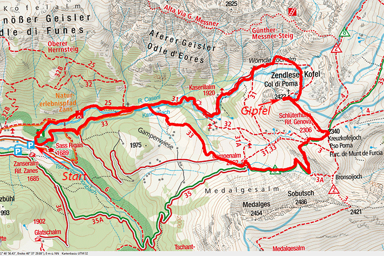 | Karten | Tabacco 030 "Brixen, Villnössertal" 1:25000 |