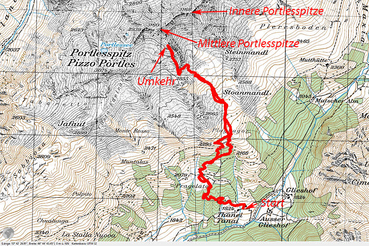 Trotz des Nichterreichen des Gipfels bin ich zufrieden. In den Vinschger Bergen, vor allem jene der Ötztaler Alpen, unterwegs zu sein, ist für mich immer ein zufriedenstellendes Erlebnis. Die Berge sind schroff und die meisten davon auch nicht überlaufen. Heute habe ich wieder ein Mal keinen Menschen getroffen (nur einen gesehen, der von den Kalten Wiesen Richtung Äußerer Portlesspitze unterwegs war); ist das Ziel auf keiner Karte benannt und führt kein markierter Weg hinauf und außerdem das Wetter nicht so gut, so trifft man meist nur wenige andere Wanderer. Jetzt fehlen mir doch noch 3 Gipfel, um meine Sammlung der Spitzen im Kamm zwischen Planeil und Matsch zu vervollständigen. :-)