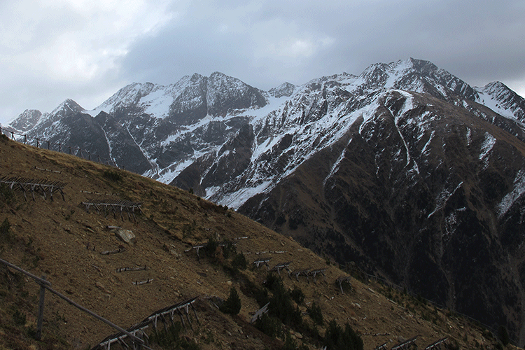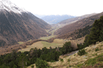Um zehn nach neun gehe beim Thanaihof los. Ich folge wieder dem Forstweg bis zu den Kalten Wiesen, halte mich dort aber rechts und folge dort einer Markierung (laut Karte die Nr. 7, aber der eingezeichnete Weg stimmt nicht ganz mit der Realität überein). Zwischendurch gehe ich weglos, wenn die Markierung m.E. für mich nicht in die richtige Richtung geht. Schlussendlich komme ich zum Eingang des Seitentales, das zwischen Mittlerer und Hinterer Portlesspitze liegt. Ich folge Steigspuren, die an der linken Talseite taleinwärts führen. Das Wetter hat sich in der Zwischenzeit verschleichtert, einige Gipfel ringsum sind von Wolken eingehüllt und es schneit ganz leicht. Auch Wind ist aufgekommen. Kein Vergleich mit dem Wetter von vor einer Woche. Ich bin mir nicht ganz sicher, welches der richtige Gipfel ist. Ein Kandidat in Gehrichtung rechts scheint nicht so einfach zu besteigen sein, zumindest führt kein offensichtlicher Weg durch die Flanke und eine Rinne links des Gipfels ist schneegefüllt, also nichts für heute. Ich folge weiter den Steigspuren, auch wenn diese auf der linken Talseite bleiben. Inzwischen ist es mir gleich auf welchen Gipfel ich komme; das Wetter dämpft meinen Optimismus und ich überlege kurz, ob ich nicht umkehren soll, beschließe dann aber weiter zu gehen, zumindest solange das Wetter nicht schlechter wird und Steigspuren ersichtlich bleiben. Die Spuren führen einen Hang in eine Einsenkung zwischen zwei Erhebungen und als ich den Kamm erreiche, kann ich mich endgültig orientieren. Die Erhebung, die wir seinerzeit von der Äußeren Portlesspitze aus erreicht haben, war definitiv nicht die Mittlere Portlesspitze. Diese liegt nördlich von mir und die Innere Portlesspitze ist jener Gipfel, den ich bereits beim Anmarsch in Verdacht hatte. Ich gehe weiter, aber nach jeder Erhebung, die mir anfangs als Gipfel erscheint, taucht der nächste auf. Ich sehe schlußendlich den eigentlichen Gipfel nicht mehr allzuweit vor mir, aber es ist ein etwas ausgesetztes Stück über Felsen zu überwinden, bevor ich zum Gipfelhang komme (der nicht so schwierig aussieht), die Felsen sind teilweise mit einer hauchdünnen Schicht Schnee bedekt und es weht ein sehr böiger Wind und das Wetter hat weiter zugezogen. Ich habe genug für heute und kehre um, obwohl es nur mehr ca. 130 Hm bis zum Gipfel sind. Der bleibt mir auch noch für ein anderes Mal. Ich steige der Aufstiegsspur entlang ab (zumindest größtenteils) und eigentlich recht schnell wieder beim Auto; auch im Aufstieg war ich nicht so langsam.