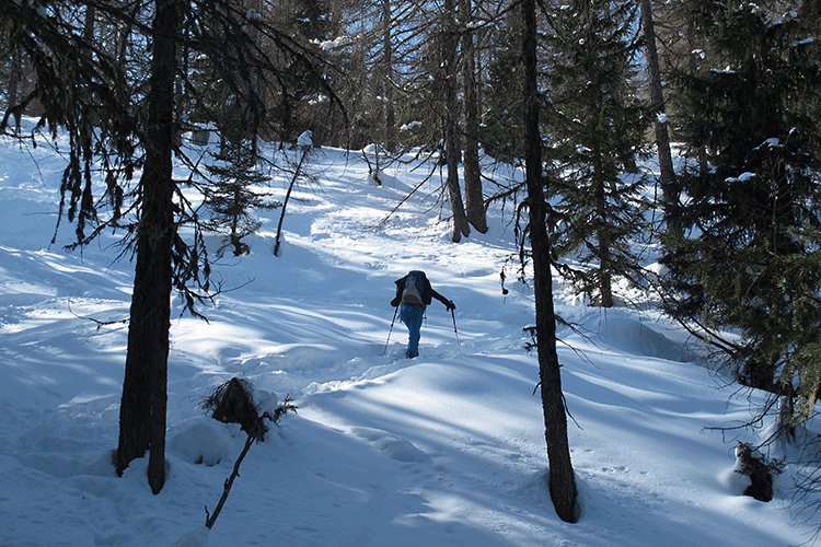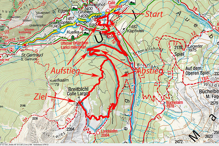 Eigentlich wäre ein ein Schitourentag mit dem A-Team angesagt gewesen, aber da Eli arbeiten musste und sich daher nicht um Willi kümmern konnte, kamen nur die Schneeschuhe in Frage. Karl konnte mir aber nicht sagen, wohin es gehen würde und für mehr als 1000 Hm reicht meine Kondition auf Schneeschuhen nicht, daher bin ich nicht mitgegangen, sondern habe mir ein passendes Ziel in Ulten ausgesucht. Das Ziel sollte, wie gesagt, nicht mehr als ca. 1000 Hm aufweisen, eher nordseitig ausgerichtet sein und konnte auch viel über Forstwege verlaufen. Der Breitbichl war das geeignete Ziel. Ich war schon weiß Gott wie oft mit den Schi oben gewesen, ein typisches Schlechtwetterziel oder für hohe Lawinengefahr geeignet und ich brauchte auch nicht besonders früh aufstehen.