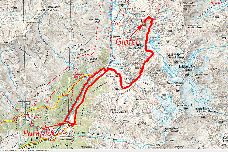 Um kurz nach halb acht geht es in Meran los und um 10 nach neun am Parkplatz unterhalb des Glieshofes. Es ist ziemlich frisch (4,5° C) und daher kommen Fleecehandschuhe und Mütze zum Einsatz. Der Steig 1 ist wegen Steinschlaggefahr geschlossen, wir gehen trotzdem. Bald entdecken wir den Grund der Sperre: der erste Bach hat bei einem der letzten Unwetter ziemlich viel Geröll den Berg heruntergebracht, stellt jetzt aber kein Problem mehr dar. Die Sperre ist jedoch geblieben. Ab der Abweigung bei der Inneren Matscheralm geht es dann zur Sache; hier legen wir Mütze und Handschuhe wieder weg, da der Weg ab hier steil in die Höhe führt. Erst 400 Hm weiter oben (2400 m) wird es wieder flacher. Nach dem Boden geht es wieder in die Höhe und das wiederholt sich noch ein Mal, bevor wir auf ca. 2800 m den ersten hellgrünen und größten Saldursee vor uns sehen. Der Weg verliert an Höhe und umrundet den See; dann geht das Spielchen wieder los. Aufwärts bis zum nächsten See und dann noch einmal bevor wir am Ufer eines schönen, kleinen Sees auf 2922 m stehen. Ab hier geht es weglos weiter; da es nur mehr ca. 100 Hm bis zum Grat sind und dann dort mehrere Gendarmen umgangen bzw. überklettert werden müssen, will ich Willi hier zurück lassen. Pustekuchen. Kaum sind wir 30 Hm weiter oben, fängt das Gewinsel und Gejaule an. Ich kehre um und hole den kleinen Schreier. Wir kämpfen uns durch den Schotter und über Steine bis zum ersten Gipfelturm. Da die nächsten Türme allle mehr oder weniger die gleiche Höhe aufweisen, beschließt Bernd, dass es für ihn reicht. Ich lasse Willi bei ihm zurück und gehe weiter. Die meisten Türme umgehe ich auf der rechten Seiten (Richtung Matscher Tal), einen überklettere ich (eine Stelle ist II-III) und dann bin ich nach insgesamt 4 Stunden auf dem Gipfel. Ich erkläre ihn zumindest zum Gipfel, da ihn einer kleiner Steinmann ziert. Ich kehre gleich um und dann gehen wir ohne weitere Rast bis zum kleinen See. Dort wird gerastet. Jeder bekommt zu essen und zu trinken, auch Willi. Er liegt anfangs erschöpft auf seiner Decke, bevor er dann zu fressen beginnt. Während unserer Rast kommt eine Vierergruppe an uns vorbei, die weiter zur Oberetteshütte geht (nehmen wir an, könnten auch über das Bildstöckljoch nach Schnals wollen) und bald danach insgesamt 6 Leute, die Richtung Saldurseen absteigen (wahrscheinlich von der Hütte kommend). In der Sonne ist es richtig angenehm, aber kaum kommt der Wind auf, wird es kalt. Für den Abstieg kommen daher die Windjacken und Handschuhe aus dem Rucksack. Langsam geht es abwärts; wie üblich zieht sich der Weg, im Gegensatz zu Willi, der ausnahmsweise mal nicht wie ein Verrückter nach unten zieht. Am letzten Saldursee, vor dem kurzen Gegenanstieg werden die Windjacken verräumt und bevor es endgültig nach unten geht, zeigt uns ein Blick zurück unseren Gipfel. Von hier sieht er wie ein richtiger Gipfel aus. :-) Der letzte Abstieg zur Inneren Matscheralm ist eine Qual; die Sonne brennt und hier geht kaum ein Windhauch. Willi bleibt immer wieder mal stehen und sucht ein schattiges Plätzchen für eine kurze Rast. Unten angekommen werden die Pfoten im Wasser gekühlt, bevor wir auf dem Wirtschaftsweg talaus hatschen. Wir sind alle froh, unten zu sein. 17,5 km, 1350 Hm und 7,5 Stunden sind genug. Im Glieshof gibt es ein alkoholfreies Hefe und einen Streuselkuchen mit Sauerkirschen und Sahne. Willi ist so ko, dass er nicht einmal einen anderen Hund anbellt.