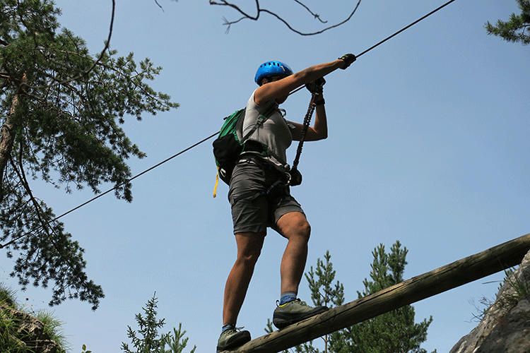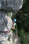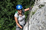 Nachdem wir am Tag zuvor aus Kroatien zurückgekommen waren von unserer Radtour "Alpe-Adria-Parenzana", wollten wir heute nichts Großes machen. Ein bißchen Klettersteigüben ist daher genau das Richtige. Laut Führer gibt es bei Finkenstein einen Klettergarten mit mehreren Übungsklettersteigen, die einzeln oder aneinandergereiht gegangen werden können und unterschiedliche Schwierigkeiten aufweisen. Wir starten also am frühen Nachmittag und, wie im Zeitalter des Navi für mich üblich, finden wir das Ziel nicht sofort. Ich verlasse mich zuviel auf das Navi und schaue zu wenig auf die Straßenbeschilderung. Wir legen am Parkplatz die Klettersteigausrüstung an und gehen dann die 2-3 Minuten zum Klettergarten. Wir fangen mit einem einfachen Klettersteig an, der am Ende anstatt einer langen Seilbrücke einen kurzen Holzstamm aufweist. Wir suchen dann den Einsteig zum nächsten Klettersteig und brauchen, wie auch im Führer genannt, ein bißchen, um diesen zu finden. Das "Risiko" ist, dass man über den Abstieg einsteigt und dann die schwierigsten Stellen im Abstieg bewältigen müsste; kann natürlich vermieden werden, in dem man den gleichen Weg wieder absteigt. Auch dieser Klettersteig ist ganz nett, etwas länger und ein kleines bißchen schwieriger. Anschließend irren wir wieder ein bißchen herum, bevor wir den nächsten Einstieg finden. Hier gibt eine etwas schwierigere Stelle, die auf Reibung zu gehen ist. Aber auch kein größeres Problem. Anschließend lassen wir es für heute gut sein. Eli ist zufrieden, dass es so gut gegangen ist, trotz ihrer Höhenangst, und sie plant für das nächste Mal einen richtigen Klettersteig hier in Kärnten.