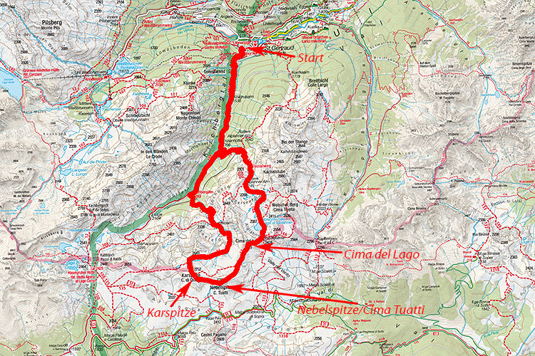 | Aufstieg | 1425 Hm, 3 Stunden bis Karspitze, 40 Minuten Übergang zur Nebelspitze, 50 Minuten Übergang bis zur Cima del Lago |