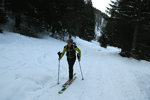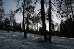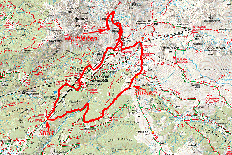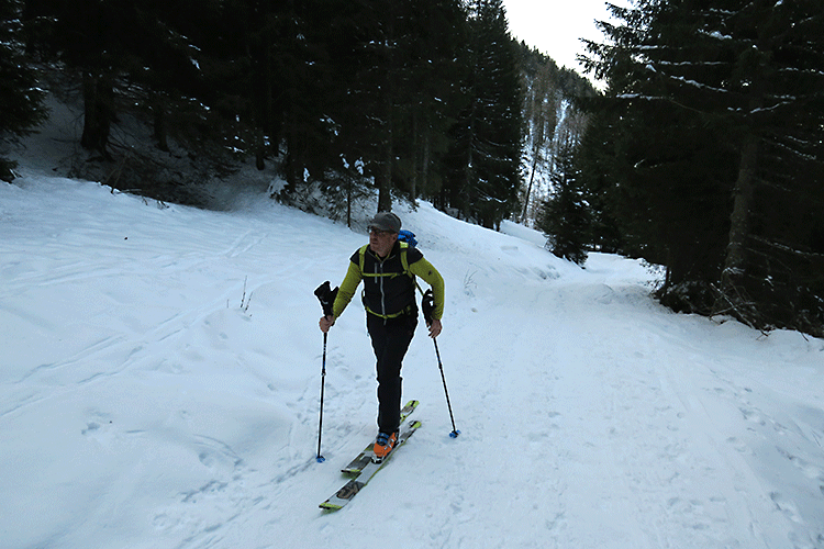 Um dreiviertel neun vom Parkplatz in Falzeben los; die Forststrasse ist im ersten Teil stark vereist und wir legen daher die Schi erst an, als es abwärts geht. Ich habe meine Frühjahrsschi mit, damit ich endlich einmal die neuen La Sportiva-Schischuhe testen kann (habe ich vor 2 Jahren im Frühjahr im Ausverkauf erstanden, bin aber dann nie dazu gekommen sie zu verwenden. Kein Wunder: 1 Schitour im vorletzten Winter und 2 Schitouren voriges Jahr. Hoffe dieses Jahr auf ein paar mehr zu kommen). Ab der Brücke über den Naifbach geht es so langsam aufwärts, ab der Abzweigung zur Moschwaldalm steilt es auf; anfangs wenig, dann bis zum Schluss eher steil. Kurz vor der Moschwaldalm wird es ebener und bevor der Steig wieder auf eine Forststrasse trifft, geht die Schispur rechts ab. Wir gehen in gleichmäßigem Tempo; zwischendurch kommt die Sonne durch den Wolkenschleier, meist ist sie nur durch die dünnen Wolken zu erahnen. Hier im Wald kommt echtes Schitourenfeeling auf; es liegt einiges an Neuschnee. Nach eindreiviertel Stunden sind wir am Gipfel; Norbert hält sich nicht lange auf und fährt gleich ab. Ich brauche etwas länger. Norbert kehrt dann auf der Meraner Hütte für einen Kaffee ein und, obwohl er mir nachruft, übersehe ich ihn und fahre weiter bis zur Kirschsteigeralm. Ich felle auf und gönne mir dann einen Riegel und etwas warmen Tee, während ich auf Norbert warte. Sobald er da ist, geht es wieder weiter. Zuerst zur Waidmannalm und dann kurz davor rechts aufwärts bis wir den Schiweg erreichen. Auf diesem bis unter das St.-Oswald-Kirchlein und dann links des Schiweges einer Schispur folgend bis oberhalb der Bergstation des Sesselliftes; von dort dem Ratrackweg folgend bis zum Kuhleiten. Auf dem Weg überholen uns laufend Schitourenrenner im Spandexanzug und mit aufgesetztem Helm auf schmalen und kurzen Rennschi (La Sportiva oder Trab). Das Schitourenfeeling ist längst dahin und es kommt fast Fitnessstudiofeeling auf. Die Kuhleitenhütte ist gut gefüllt und wir gönnen uns ein alkoholfreies Hefe. Norbert möchte anschließend den Hang vor der Hütte abfahren, aber da ich keine Lawinenausrüstung mit habe, verzichten wir darauf und bleiben auf der Piste. Wir sind nicht langsam unterwegs und sind daher bald am Piffinger Köpfl. Ich bin normalerweise kurz vor dem Köpfl immer links abgebogen und kurz vor der Rotwandhütte auf die Piste gekommen, aber diesmal führt Norbert gerade aus bis zum Köpfl. Dort nehmen wir aber fälschlicherweise die Wallpachpiste anstatt der Falzebenpiste; wäre früher kein Problem gewesen, aber in der Zwischenzeit haben sie im Kreuzungsbereich der Pisten Unter- bzw. Überführungen gebaut, so dass man nicht mehr von der einen Piste auf die andere wechseln kann. Wir müssen daher über die Abzäunung steigen, bevor wir wieder auf dem richtigen Weg sind. An der Zuegghütte vorbei sausen wir Richtung Falzeben. Ich würde mir hier auf den Pisten deutlich schärfere Kanten wünschen, aber ich glaube, ich habe die Kanten das letzte Mal vor ca. 5 Jahren schärfen lassen. Aber was soll's; anstatt präzise auf den Kanten zu carven, drifte ich eben durch die Kurven. Geht auch. Die Abfahrt dauer nur 20 Minuten und dann sind wir beim Auto. zwar nicht um halb eins, sondern erst um halb zwei, aber der ganze Nachmittag steht Norbert noch zu Verfügung.