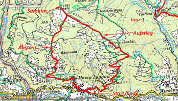 | Aufstieg | Tour 1 - Samalm: 900 Hm, 3 Stunden, 5,6 km Tour 2 - Kircher Alm: 750 Hm, 3 Stunden 15 Minuten, 5,1 km Tour 3 - Soleck: 1050 Hm, 2 Stunden 15 Minuten, 4 km Tour 4 - Bladner Joch: 535 Hm, 1 Stunde 15 Minuten, 4 km |