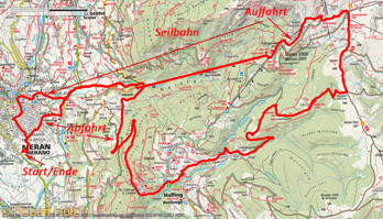 Noch ein bißchen später als üblich gestartet; erst kurz vor 1 Uhr. Von zuhause geht es über Nebenstraßen bis zur Talstation der Meran-2000-Seilbahn. Bis dort haben wir schon mehr als 300 Hm überwunden. Wir haben die Kabine für uns alleine; bald sind wir oben angekommen. Auf dem breiten Weg geht es Richtung Kesselberg; die steilsten Stücke schieben wir. Bei der Bergstation des Sesselliftes nehmen wir den Weg, der an der Waidmannalm vorbei zur Kirchsteigeralm führt. Ein Stück bergauf und wir kommen an der Meraner Hütte an. Wir kehren ein und bekommen noch etwas zu essen obwohl wir schon außerhalb der Küchenzeiten sind. Noch ein Stück weiter aufwärts und wir sind am kleinen Joch, wo der Weg ins Sarntal führt. Wir nehmen aber den Steig Nr. 4, der unterm Spieler hindurch führt. Mit ein bißchen Schieben überwinden aufwärts wir die schwierigsten Stellen; schon bald geht es abwärts zum Kreuzjöchl. Ab hier finden wir uns auf der Forststraße wieder. An der Maiser Alm vorbei kommen wir bald zur Moschwaldalm. Hier kehren wir nochmals ein, um etwas zu trinken. Der Rest ist einfach; auf der Forststraße weiter bis diese in die Teerstraße übergeht und dann sind wir auch schon auf der Landesstraße nach Meran. Wir lassen die Räder laufen und sind zeitweise schneller als die Autos. Nach knapp 3 Stunden reiner Fahrzeit sind wir schon wieder zu Hause.